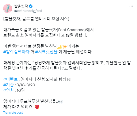 최근 온더바디의 풋샴푸 브랜드인 ‘발을씻자’가 재치 있고 기발한 SNS 마케팅을 보여주었어요. 평소에도 SNS, 특히 엑스(구 트위터)를 통해 소비자들과 소통을 활발히 하며 SNS의 순기능을 십분 활용하고 있는 브랜드로 유명한 발을씻자가 이번에는 엑스에서 ‘글로벌 앰버서더 모집’ 이벤트를 열며 화제가 되었어요.