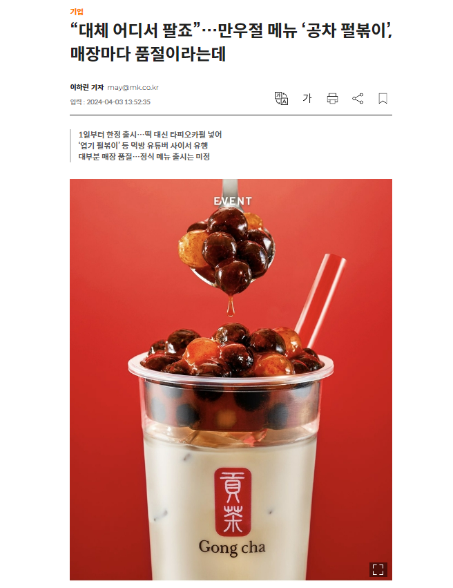 공차는 펄볶이 출시에 앞서 3월 말 홍대점, 명동점, 서울대 점 등에서 한정으로 출시한 뒤 만우절 날부터 전국 지점에서 판매를 시작했고, SNS에서의 화제성을 증명하듯 품절 대란이 일어나기도 했어요.