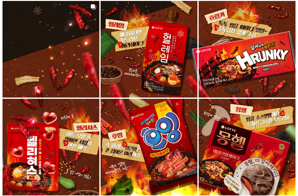 롯데웰푸드는 '마라맛' 제품 이벤트를 통해 설레임, 크런키, 돼지바, 몽쉘 등 인기 제품에 마라맛을 입힌 이미지를 공개하며 이 중 하나를 실제로 출시하고 싶다는 의사를 나타냈어요. 마라맛 제품 중에서는 '마라크림케이크'라고 적힌 몽헬이 가장 많은 '좋아요'를 받으며 소비자의 반응을 끌어냈어요.