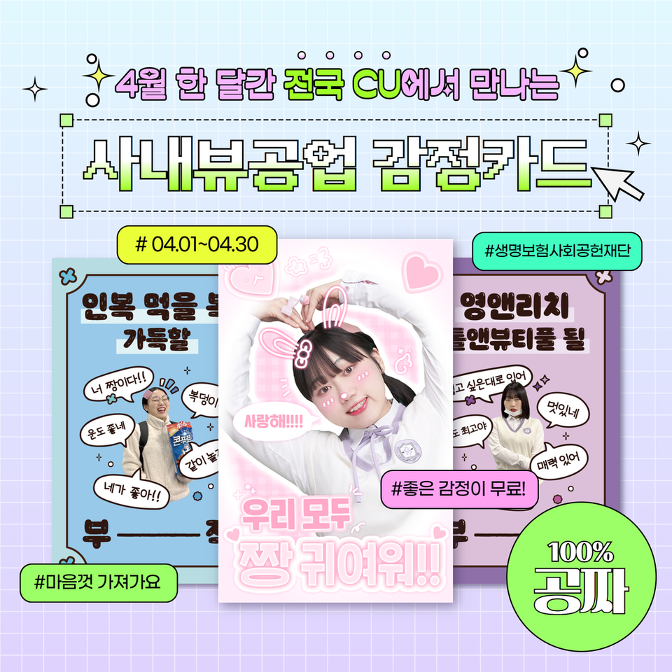 이 캠페인은 생명보험재단에서 감정 카드로 청소년들의 마음을 위로하기 위해 기획한 오프라인 캠페인으로 전국 1만 7천여 개의 CU 점포에서 만나볼 수 있어요.