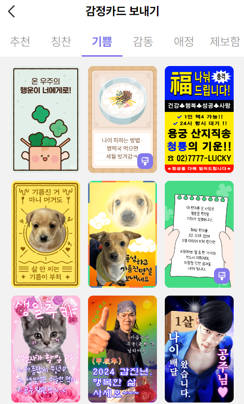 감정카드는 1인 상황극 콘텐츠로 유명한 유튜버 ‘사내뷰공업’의 다양한 부캐들로 총 10종류나 제작되었어요. ‘열심히 하는 건 결과가 어떻든 그 자체로 의미 있는 거야’, ‘우리 모두 짱 귀여워!’ 등 행복, 응원, 희망의 메시지를 유쾌하게 풀어내었죠.