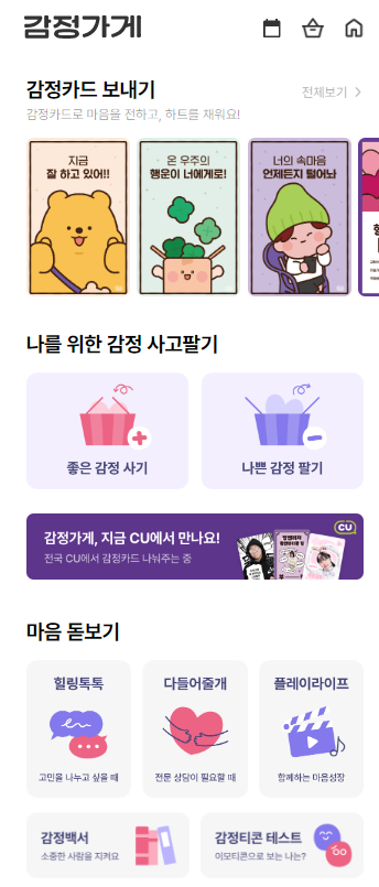 또, 감정 카드 뒷면의 QR코드 스캔하거나, 포켓 CU에서 감정 가게에 접속하면, CU의 자체 캐릭터인 ‘CU프렌즈’ 전용 감정 카드를 포함해 더 다양한 감정 카드를 만나볼 수 있어요.