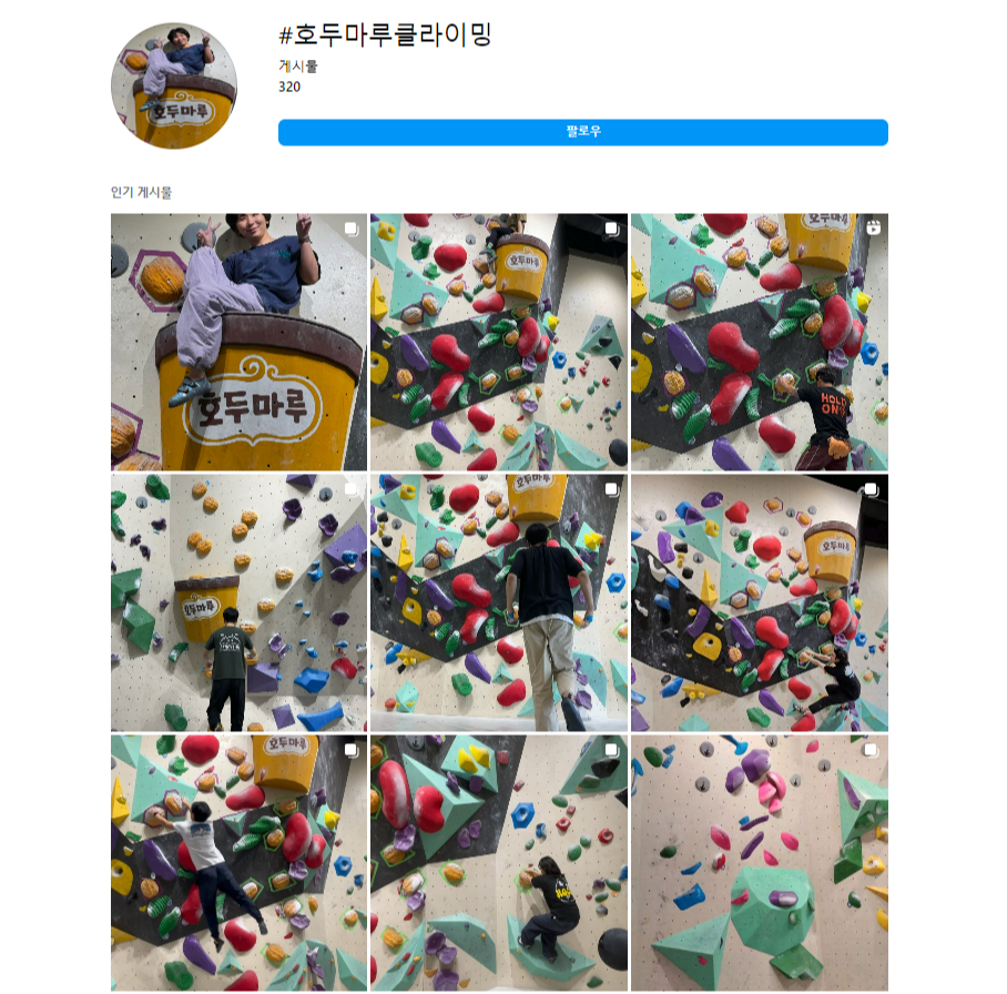 클라이머 사이에는 자신이 어떤 코스로 움직였는지, 어떤 자세로 오르는지 등등을 기록하고 복습하기 위해 사진과 영상으로 남기는 문화가 있어요. 때문에 호두마루 이벤트처럼 대놓고 ‘사진 찍기 좋게’ 만든 이벤트에도 큰 거부감이 없었던 것이죠.
