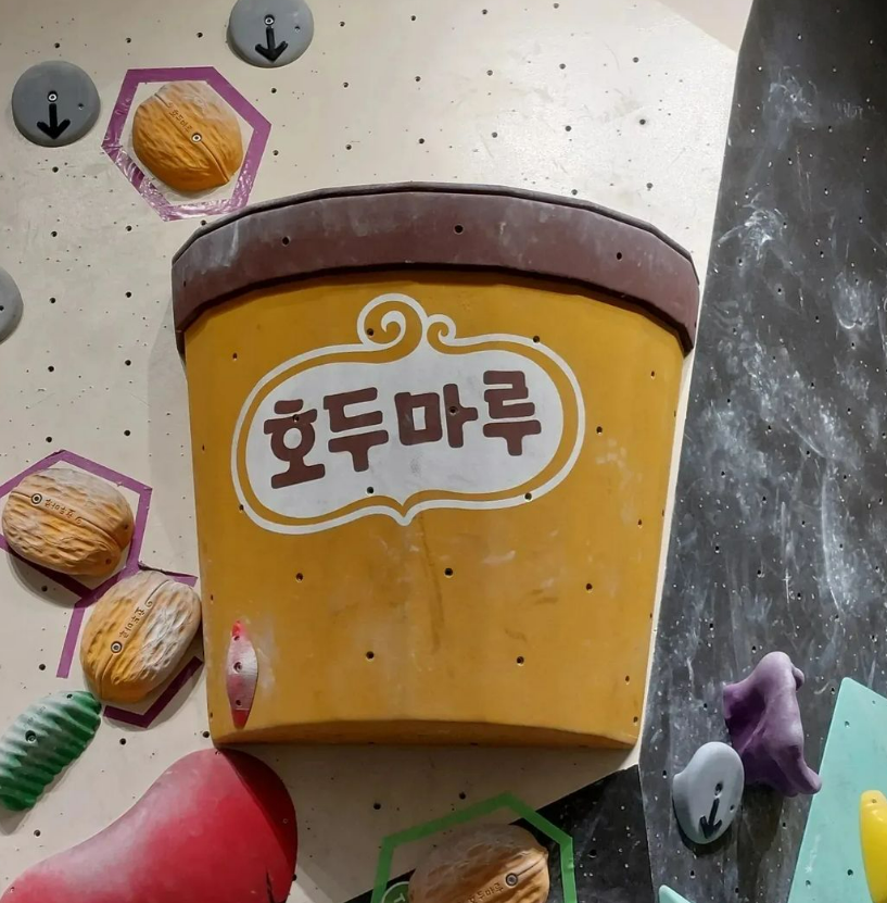 호두마루 코스는 난이도를 ‘중간’ 정도로 설정하여 초보와 고수 모두 두루두루 이용할 수 있도록 제작했습니다. 또, 잡고 밟고 올라갈 수 있는 홀드들 외에도 호두마루 아이스크림 패키지 모양은 위에 앉아 인증샷을 찍을 수 있도록 배치했어요.