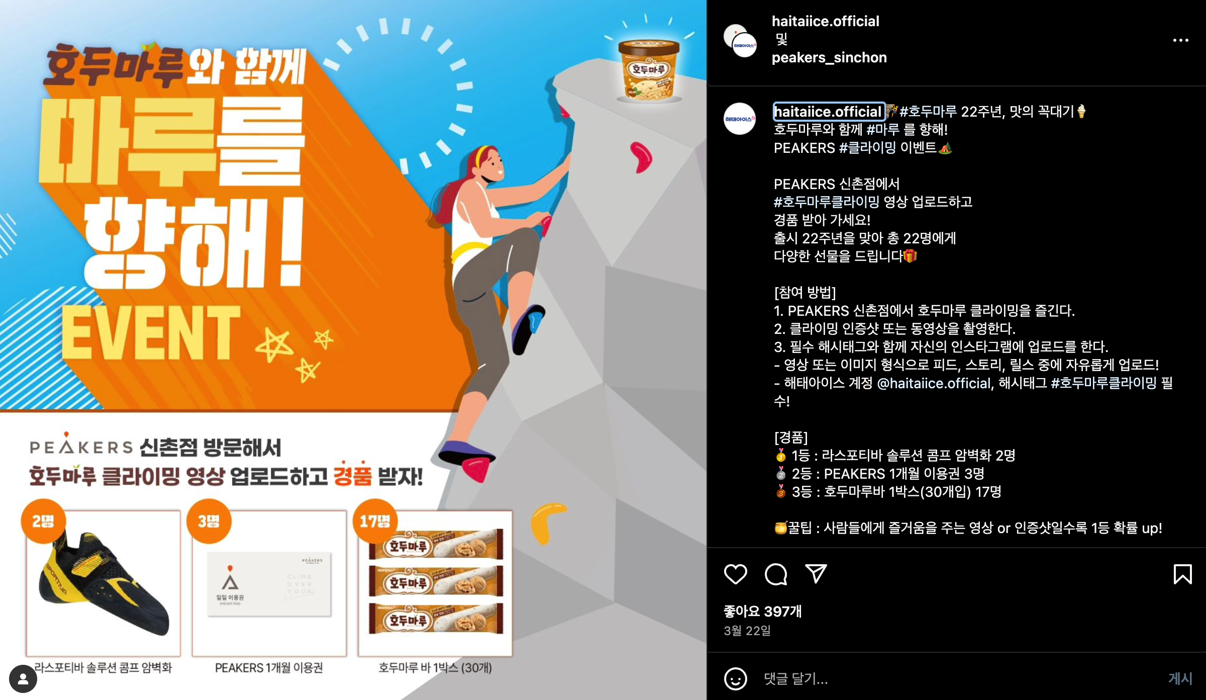 출시된 지 무려 22년이 된 호두마루 아이스크림. 누구에게나 익숙할 정도로 오랜 역사가 있는 호두마루가 22주년을 맞이하여 이색적인 이벤트를 열었어요. 바로 실내 클라이밍장 ‘피커스’와 콜라보한 ‘호두마루와 함께 마루를 향해!’ 이벤트입니다.