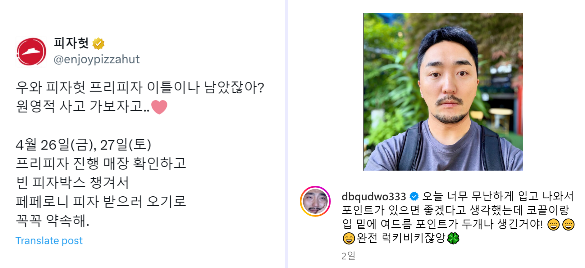 그럼 이러한 밈을 어떻게 사용하면 좋을까요? 좋은 활용 예시로는 피자헛과 유병재가 있어요. 피자헛은 이벤트 홍보 목적으로 원영적 사고를 활용해 참여를 독려했고, 평소 재치 있는 게시물을 올리던 유병재는 짜증 날 수도 있는 상황을 긍정적으로 해석하며 럭키비키라는 말을 활용했어요. 이런 식으로 상황을 긍정적으로 해석함과 동시에 원영적 사고, 럭키비키라는 말을 함께 사용하면 된답니다!