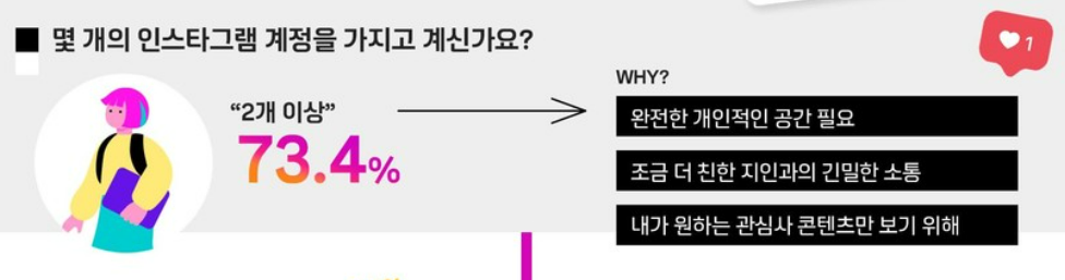인스타그램이 오픈서베이와 함께한 조사에 따르면, 국내 Z세대 이용자 중 인스타그램이 오픈서베이와 함께한 조사에 따르면 73.4%가 2개 이상의 계정을 운영하고 있다고 해요. 원인은 대부분 개인적인 공간이 필요하다는 이유였어요. 이러한 조사는 최근 젊은 세대를 중심으로 기존 SNS에 대한 피로감이 증가하고 있는 것을 잘 드러내고 있어요.