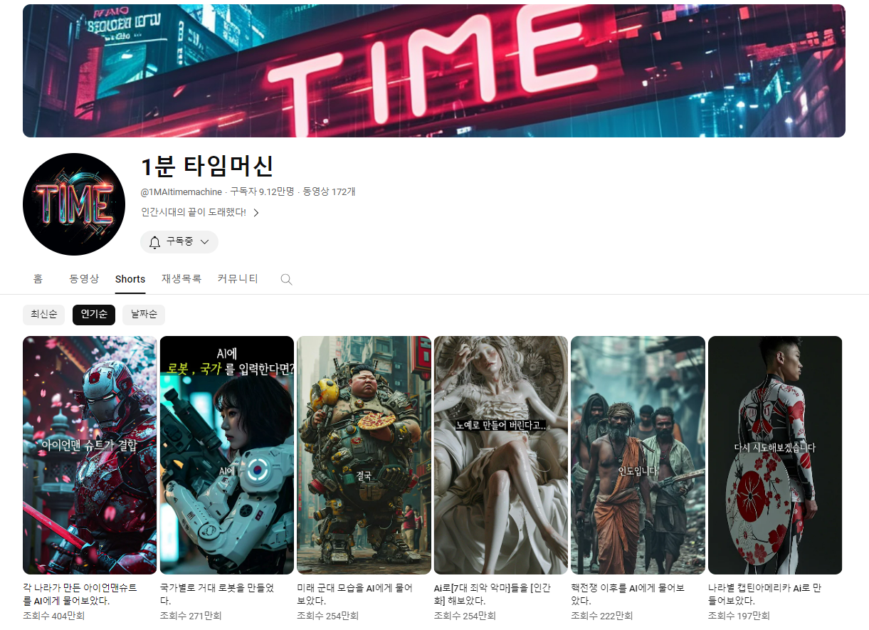 채널 '1분 타임머신'은 세계 각국의 미래 모습이나 사물, 동식물을 의인화하는 AI 그림 콘텐츠를 주력으로 하고 있어요. 이 채널은 구독자들이 평소 상상해 오던 시나리오를 현실로 그려내어, 2800만 회가 넘는 조회수를 기록하기도 했어요.