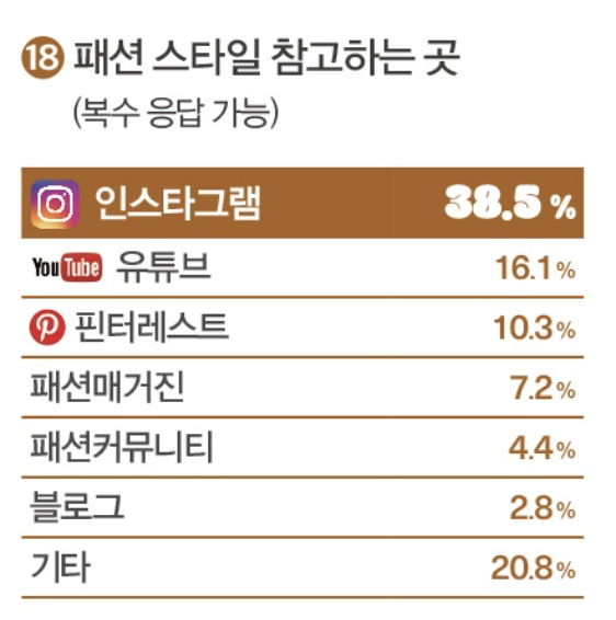패션비즈에서 진행했던 설문조사에 따르면, ‘어디서 패션 스타일을 참고하는가’에 대한 질문에 응답자의 3분의 1이 넘는 38.5%는 인스타그램을 참고한다고 밝혔고, 그 다음이 유튜브(16.1%), 핀터레스트 (10.3%)였어요.