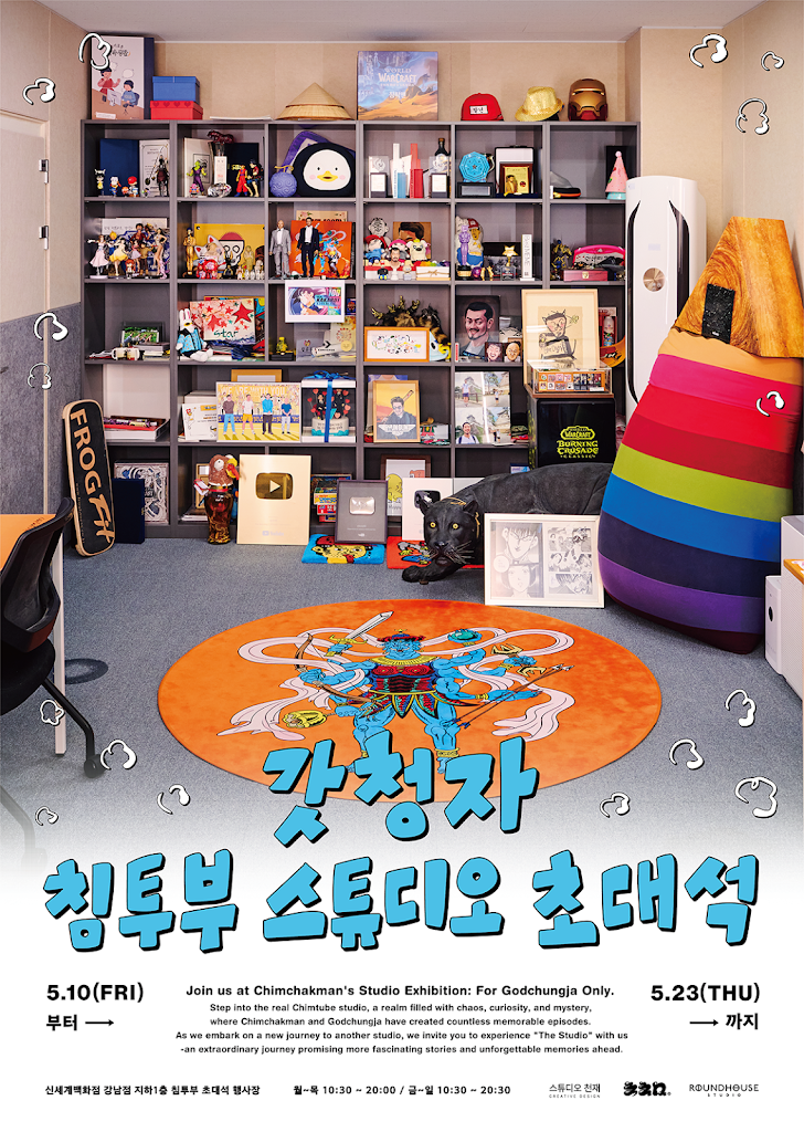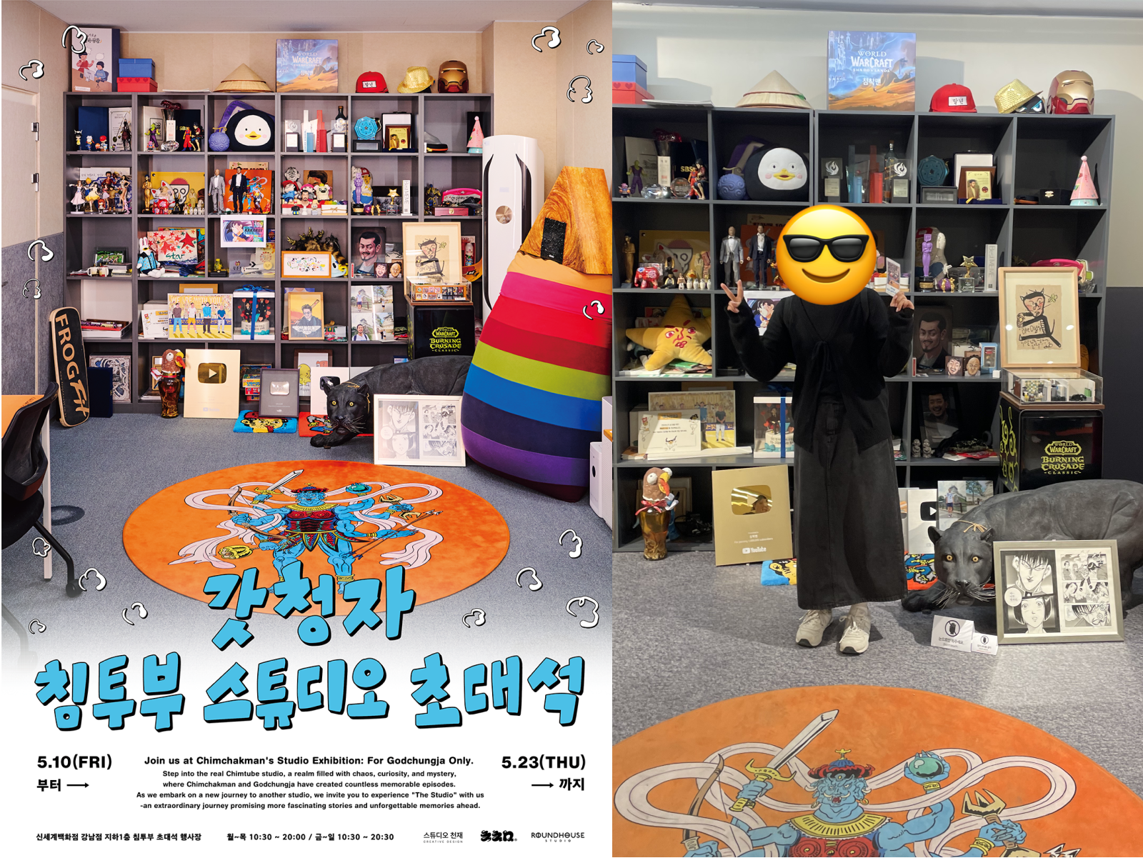 이번 팝업은 침착맨의 방송 스튜디오에 팬들을 초대하는 컨셉이었습니다. 침착맨 유튜브에서는 방송 스튜디오에 게스트를 초대하는 콘텐츠를 초대석이라고 부르는데요. 그런 스튜디오에 갓청자(*침착맨 구독자)를 초대한다는 의미에서 '갓청자 침투부 스튜디오 초대석'이라고 이름 붙인 거랍니다.