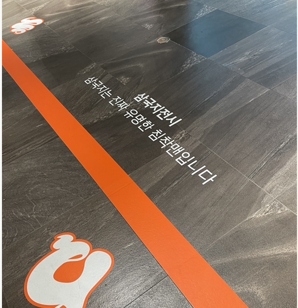 그리고 내부 바닥에는 주황색 안내선이 있어서 여러 공간을 동선에 맞춰 이동할 수 있었습니다. 또 각 공간마다 설명이 붙어 있어 이를 읽으며 소소한 재미를 느낄 수 있었어요! 바닥까지 세심하게 신경 쓴 디테일을 통해 팝업스토어에 많은 공을 들였다는 것을 알 수 있었습니다.