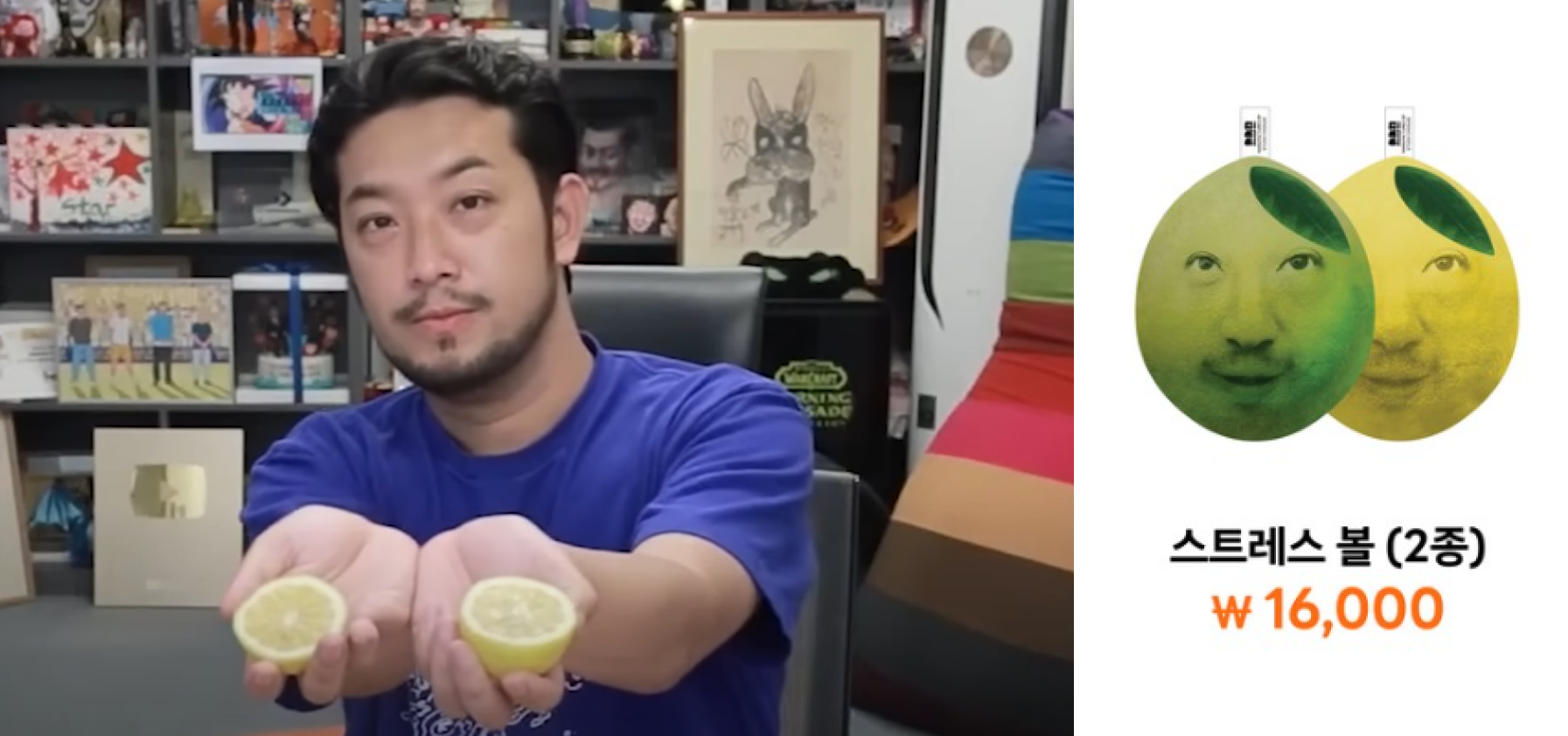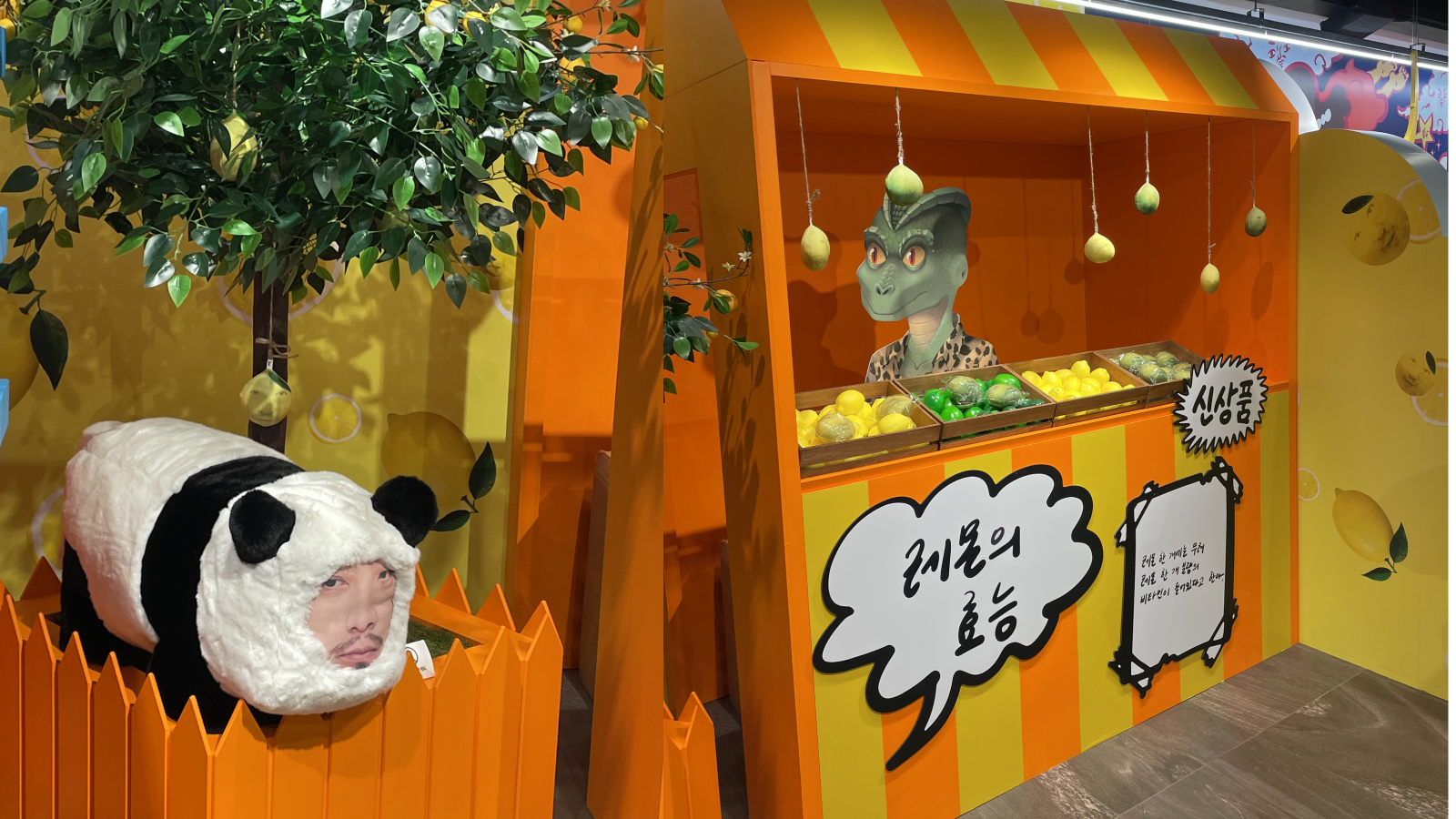 이 외에도 침착맨 팝업스토어에는 다양한 포토존들이 있었어요! 특히, 레몬침바오존에서 사진 찍는 분들이 많이 계셨답니다. 레몬침바오존에는 레몬 나무와 가판대에 레몬 모양의 침착맨 굿즈가 달려 있습니다. 그리고 침착맨 버전 푸바오 인형과 독깨팔 등신대가 있는 것이 특징이었어요.