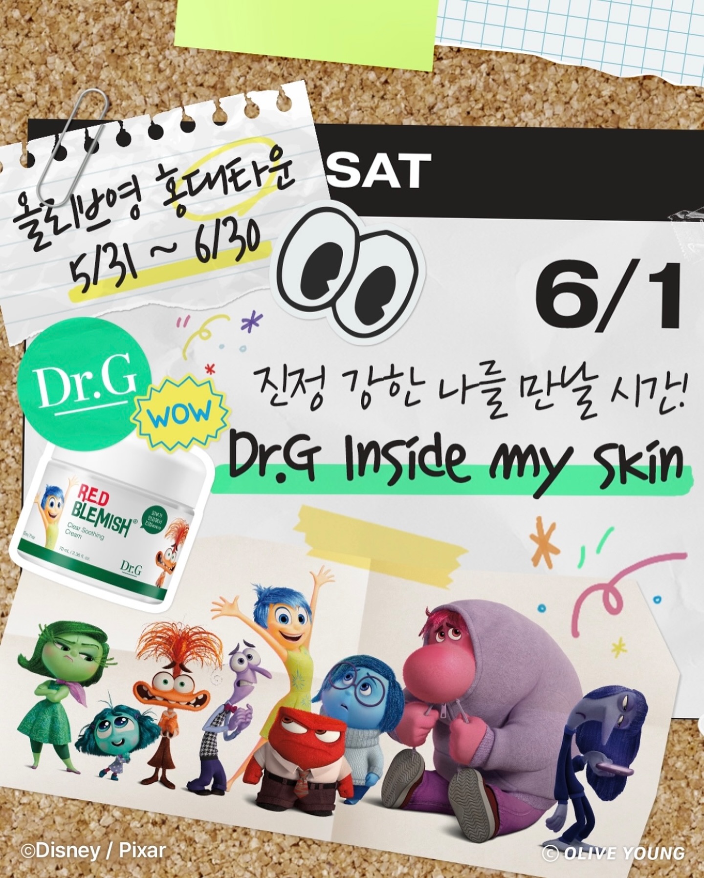 올리브영 홍대타운점은 타 매장과 다르게 오프라인 체험을 강화한 상권을 대표하는 매장이었어요. 제가 방문했을 땐 6월 개봉 예정인 인사이드 아웃 2와 Dr.G의 콜라보 팝업이 진행되고 있었는데, 무엇보다 올리브영에서 팝업을 즐길 수 있다는 점이 매력적으로 다가왔어요.