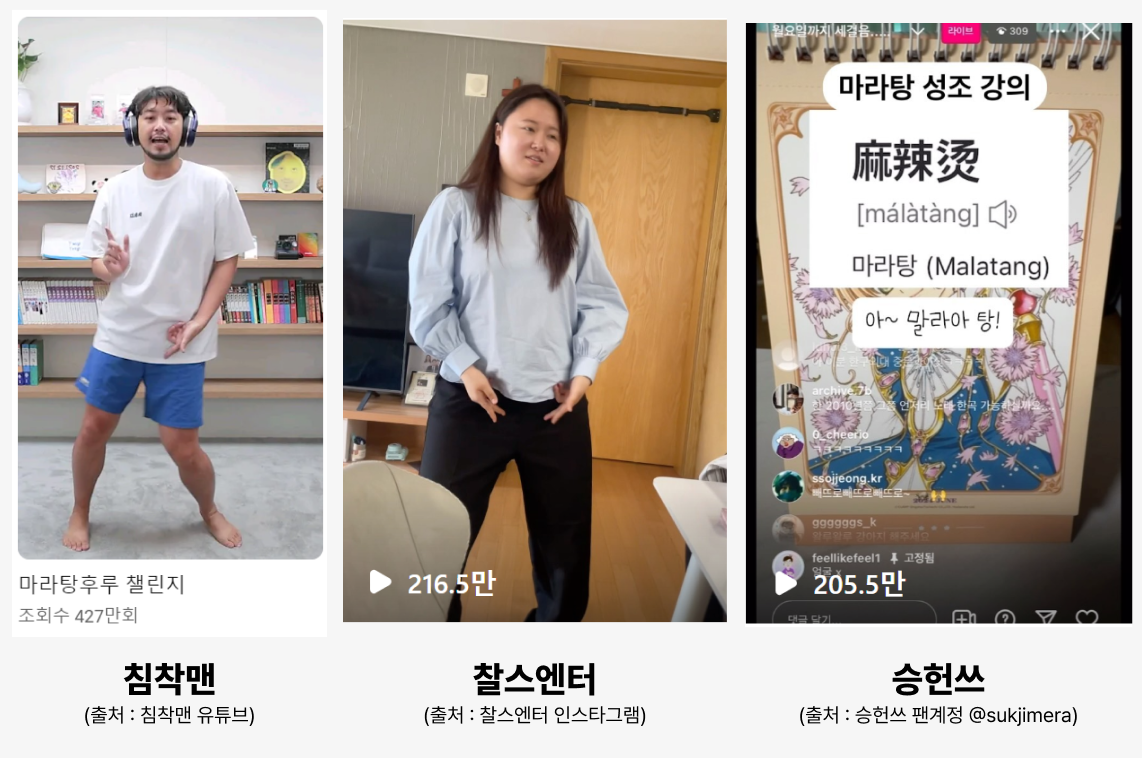 해당 챌린지는 10대 학생들 사이에서 틱톡을 중심으로 인기를 끌다가 점점 확산되었는데요. 침착맨, 찰스엔터, 승헌쓰 등 요즘 가장 핫하다고 할 수 있는 크리에이터들이 마라탕후루 챌린지에 참여하면서 인기가 더욱 커졌답니다. 세 영상 모두 200만 이상의 조회수를 기록한 걸 보면 얼마나 화제성 있는 챌린지인지 실감이 되실 거예요.