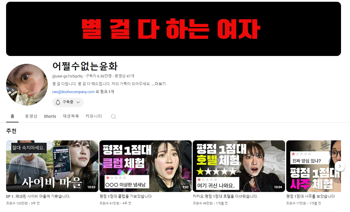 최근 많은 이들의 유튜브 알고리즘에 뜨기 시작한 유튜버가 있습니다. 바로 6.5만 명의 구독자를 가진 유튜버, '어쩔수없는윤화'인데요. 본인을 별 걸 다 하는 여자라고 칭하면서 주로 평점 1점대의 장소들을 리뷰하고 있어요.