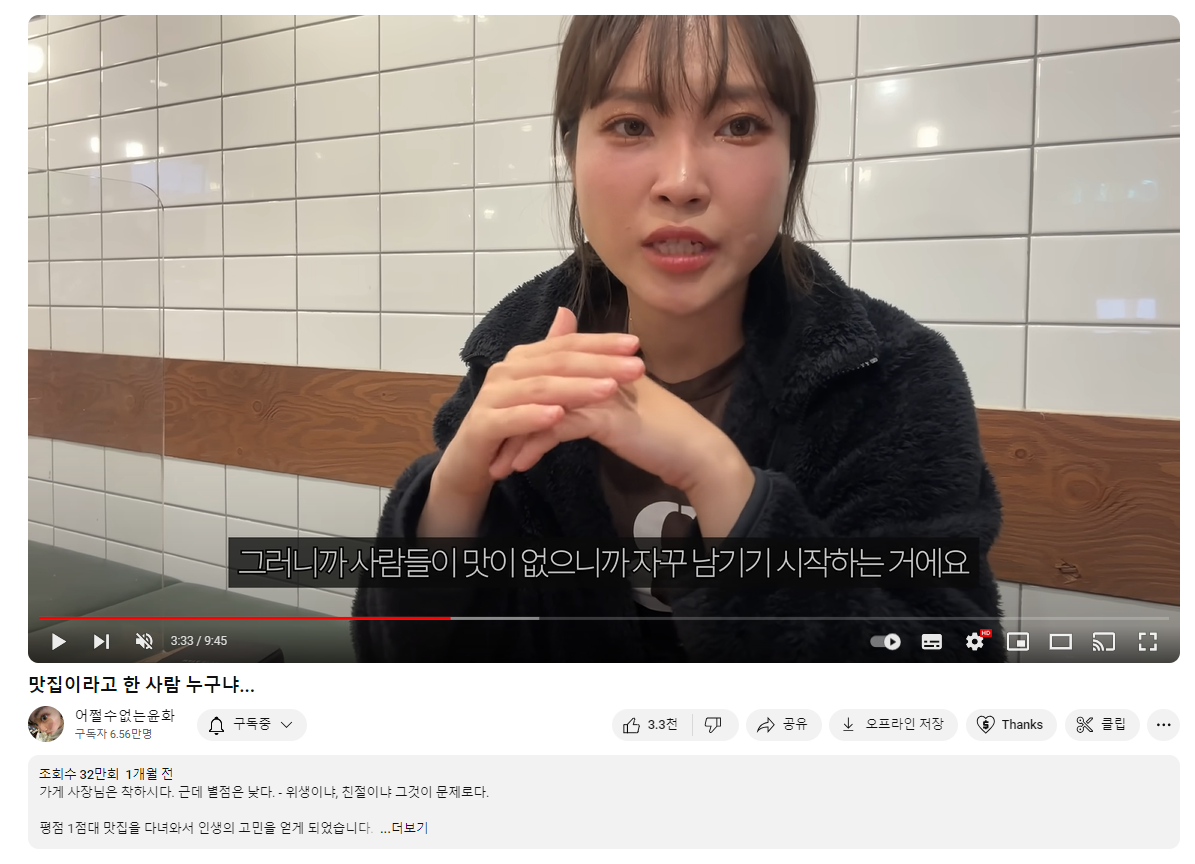어쩔수없는윤화라는 유튜버의 인기 요인 중 하나는 가식 없는 모습이에요. 평점이 낮은 공간에 방문하다 보니 위생상으로 불쾌할 수 있는 부분들이 종종 등장하는데요. 그럼에도 거리낌 없이 모든 장면들을 담고 솔직하게 행동하는 모습이 호감 포인트로 자리 잡았습니다.