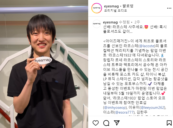 마라탕후루의 인기를 빠르게 포착하고 활용한 대표적인 브랜드는 '아이즈매거진'입니다. 아이즈매거진은 라코스테 팝업을 홍보하는 릴스 콘텐츠에 챌린지를 활용했어요. 마라탕후루 노래를 라코스테 팝업에 맞춰 개사한 것인데요.