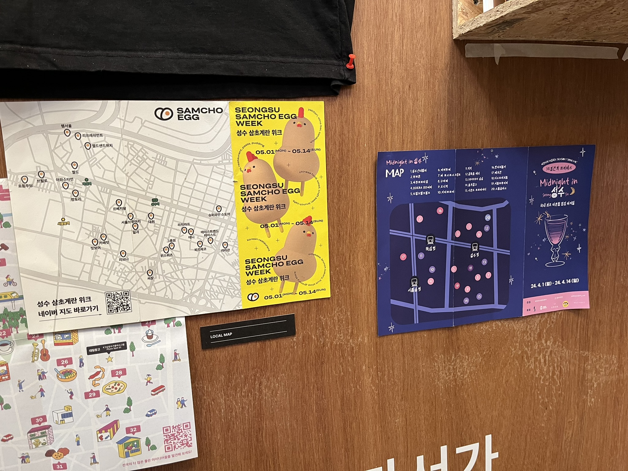 성수동을 무대로 활동하는 '성수교과서' 님 섹션에서는 진행하신 '성수 삼초계란 위크', '미드나잇 인 성수' 등 프로젝트 관련 자료들을 볼 수 있었는데요. 낮만큼 활발하지 않은 성수의 야간 상권을 살리기 위한 '미드나잇 인 성수' 프로젝트를 통해, 지역을 발전시키는 데에 기여할 만큼 커진 로컬 큐레이터의 영향력을 체감했습니다.