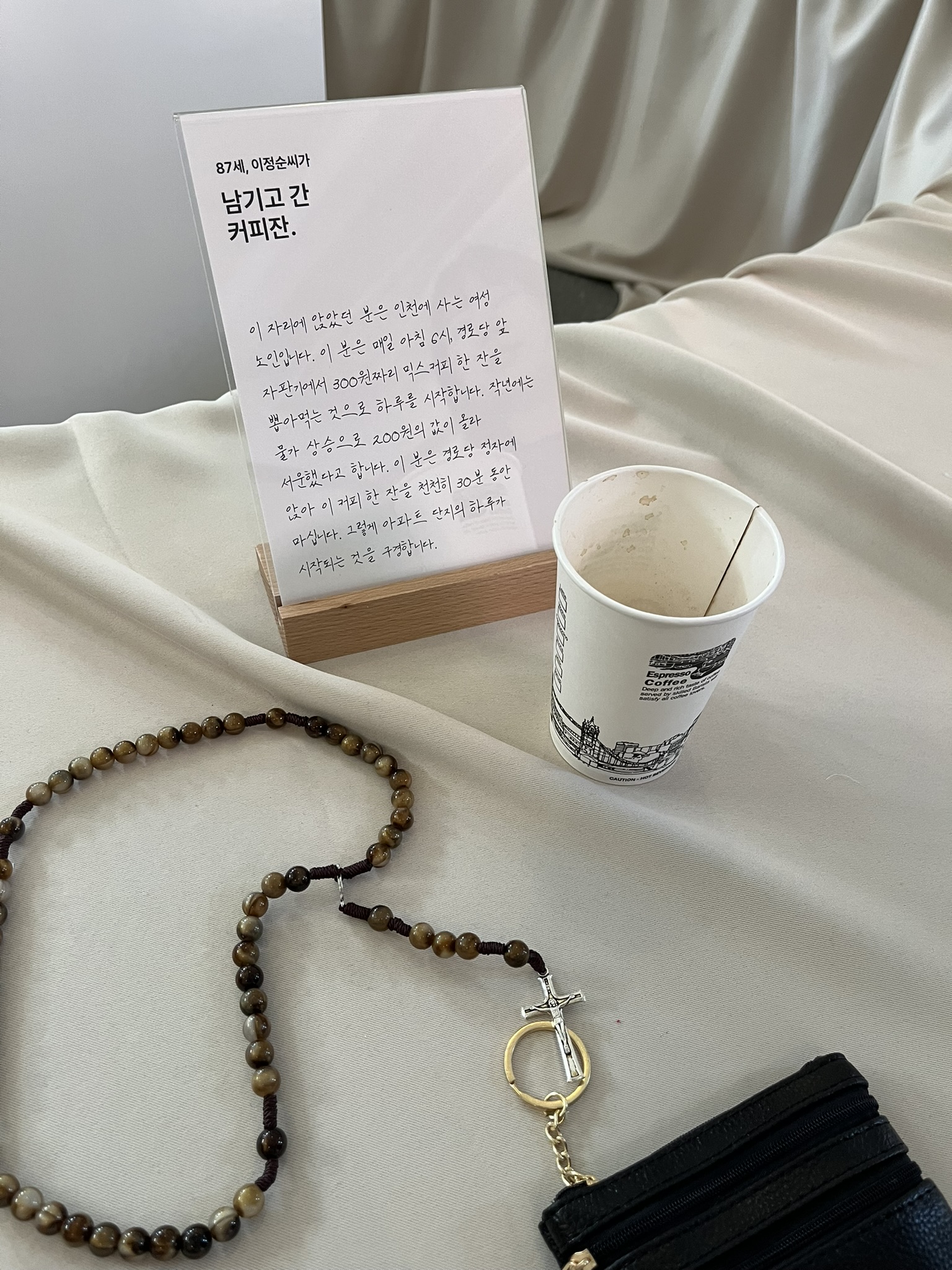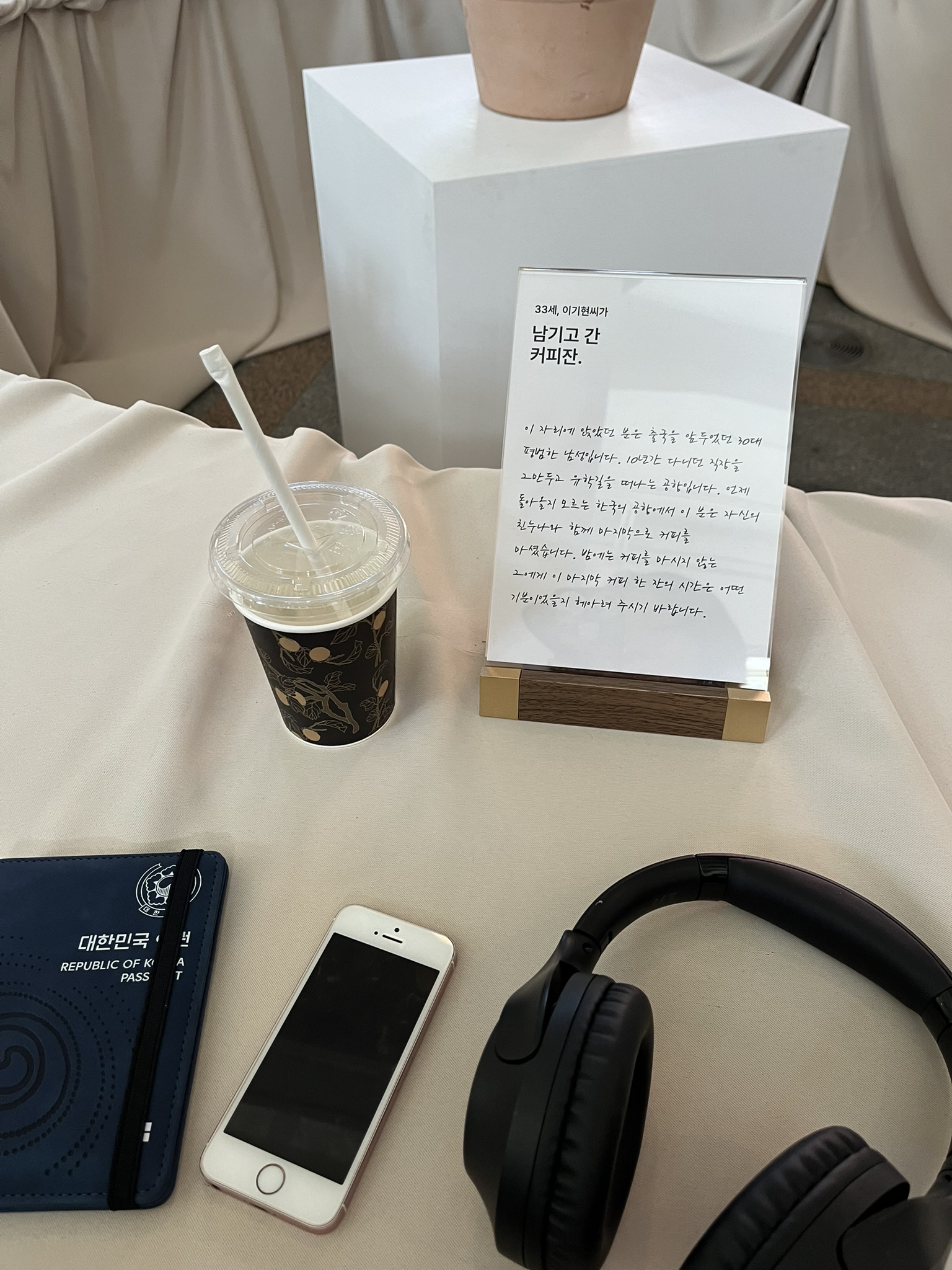 전시 공간 가운데에 자리한 큰 원형 테이블에는 각각의 커피에 담긴 어떤 사람들의 인생을 담은 전시물이 있었습니다. 누구나 공감할 구체적 페르소나 스토리텔링으로 전시가 추구하는 관점을 풀어내니, 마음에 와닿는 느낌이었습니다. 사진을 자세히 보시면 빨대가 씹혀있다거나, 인물에 상황에 맞춘 여권이 함께 연출되어 있는 등 디테일을 느낄 수 있어요.