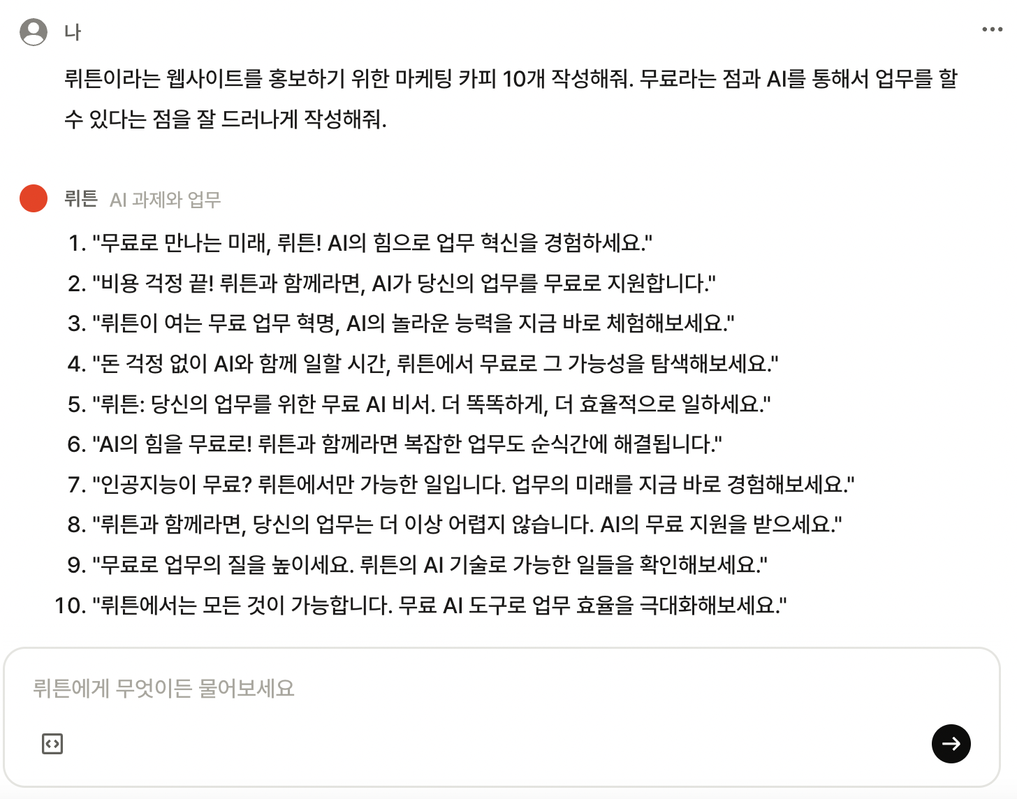 홈페이지 메인 화면을 보면 [알아서 써주는 마케팅 카피] 블럭 기능을 클릭하고 명령어를 입력하면 여러 가지의 카피라이팅을 술술 적어줍니다. 꼭 뤼튼이 아니어도 ChatGPT와 같은 AI를 활용하여 막막했단 카피라이팅 문제를 해결해 보세요.