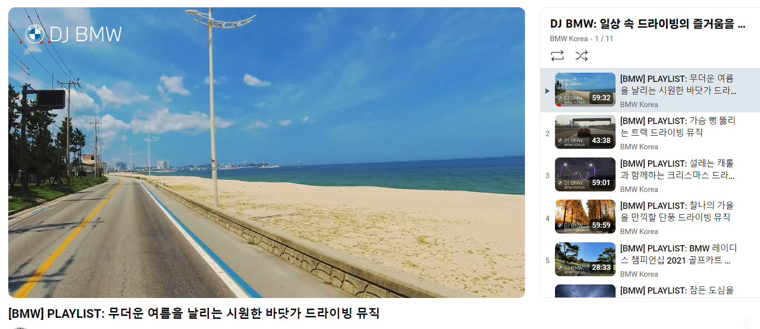 자동차 브랜드로서 주행 경험을 중요하는 BMW는 최근 유튜브 플레이리스트를 활용해 이 경험을 더욱 강화하고 있어요. BMW의 플레이리스트는 다양한 주행 상황에 맞춘 음악으로 구성되어 있어요. 예를 들어, '고속도로 드라이브'를 위한 플레이리스트는 에너제틱한 음악을 위주로 구성되어 있는 것이죠.