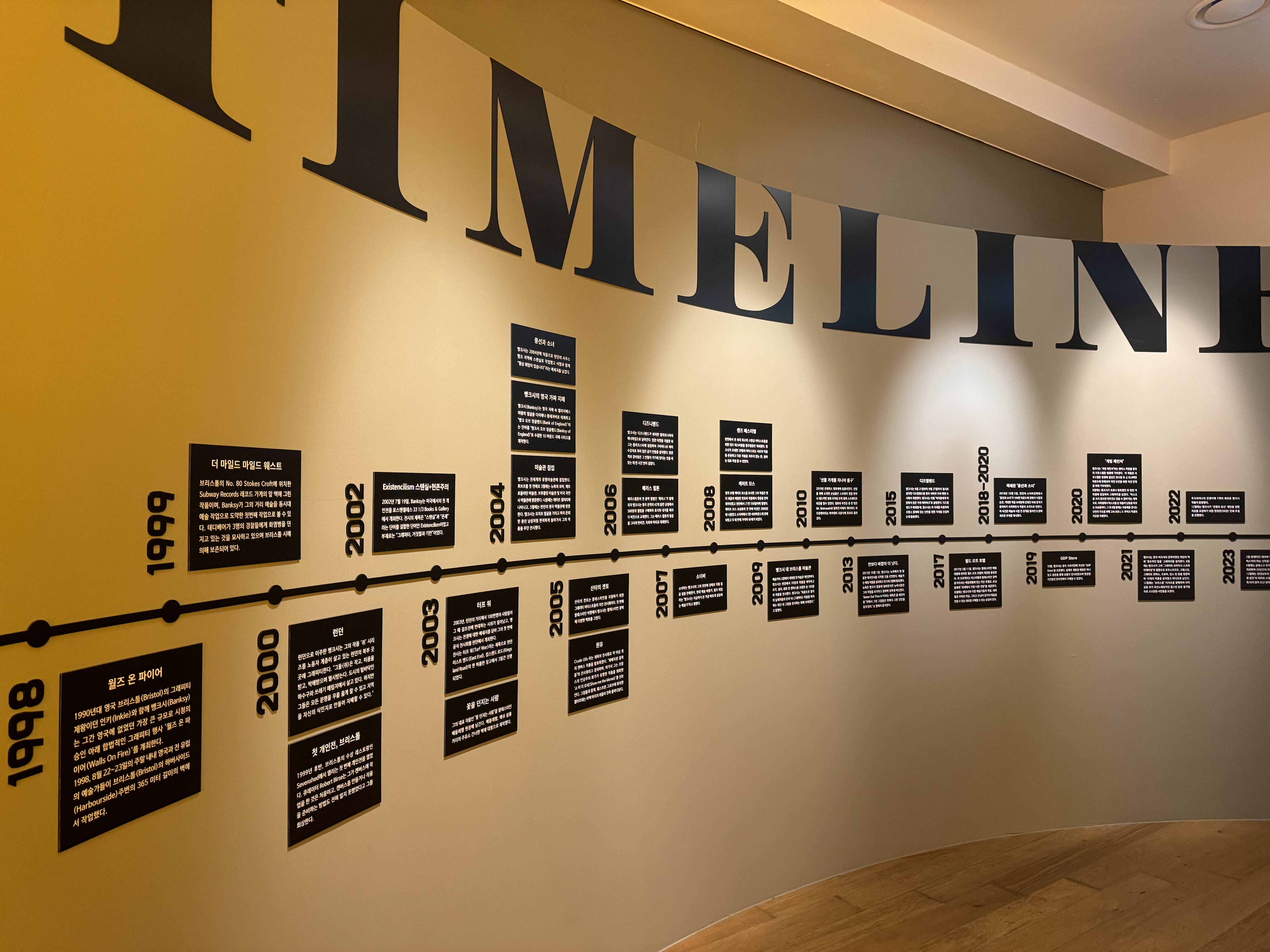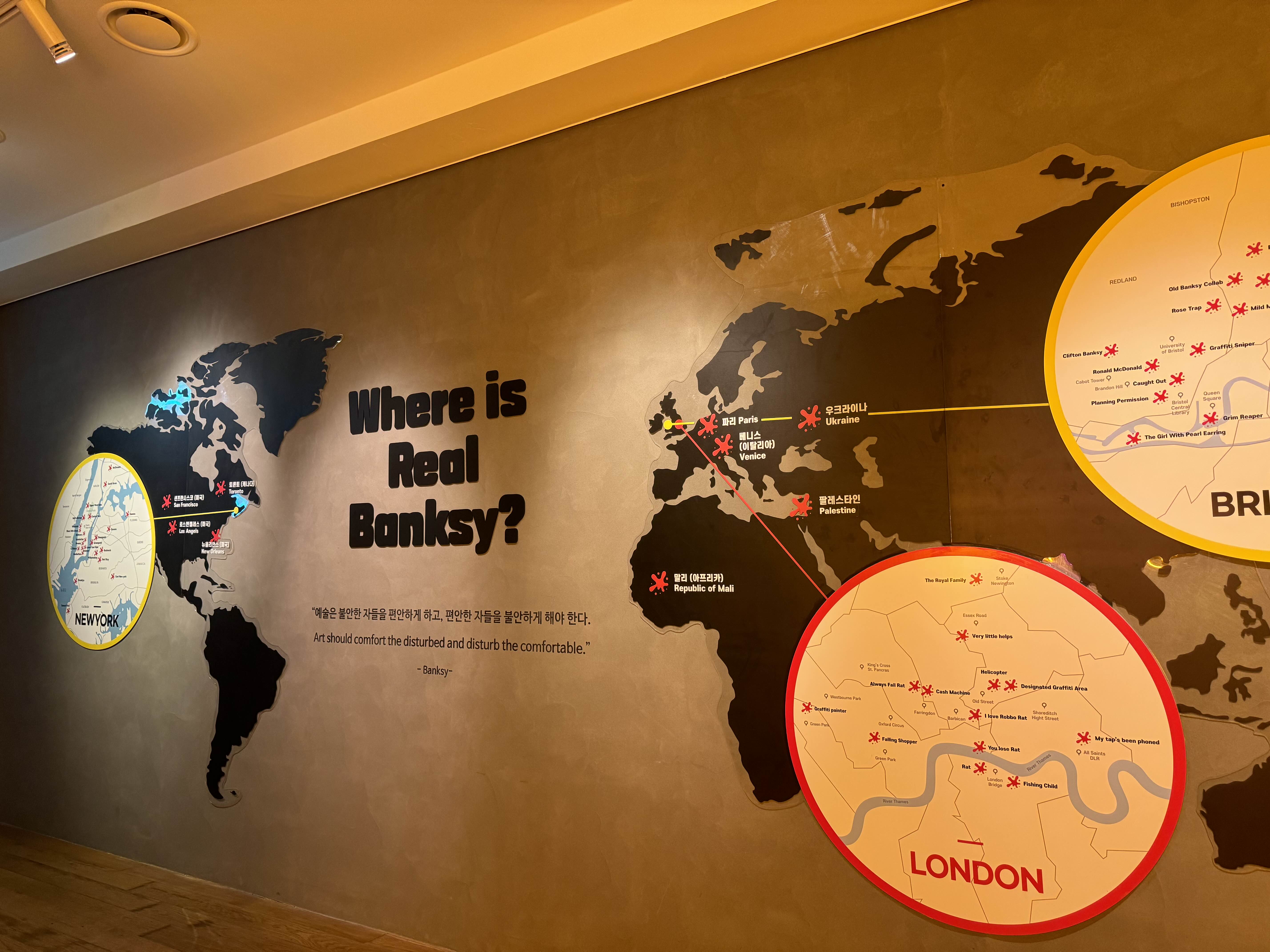 전시회에 들어가자마자 뱅크시의 연보와 그가 활동했던 지역들이 나와있는데요. 그래피티 아티스트 출신인 만큼 다양한 지역에서 꾸준히 활동을 해온 것을 볼 수 있어요.