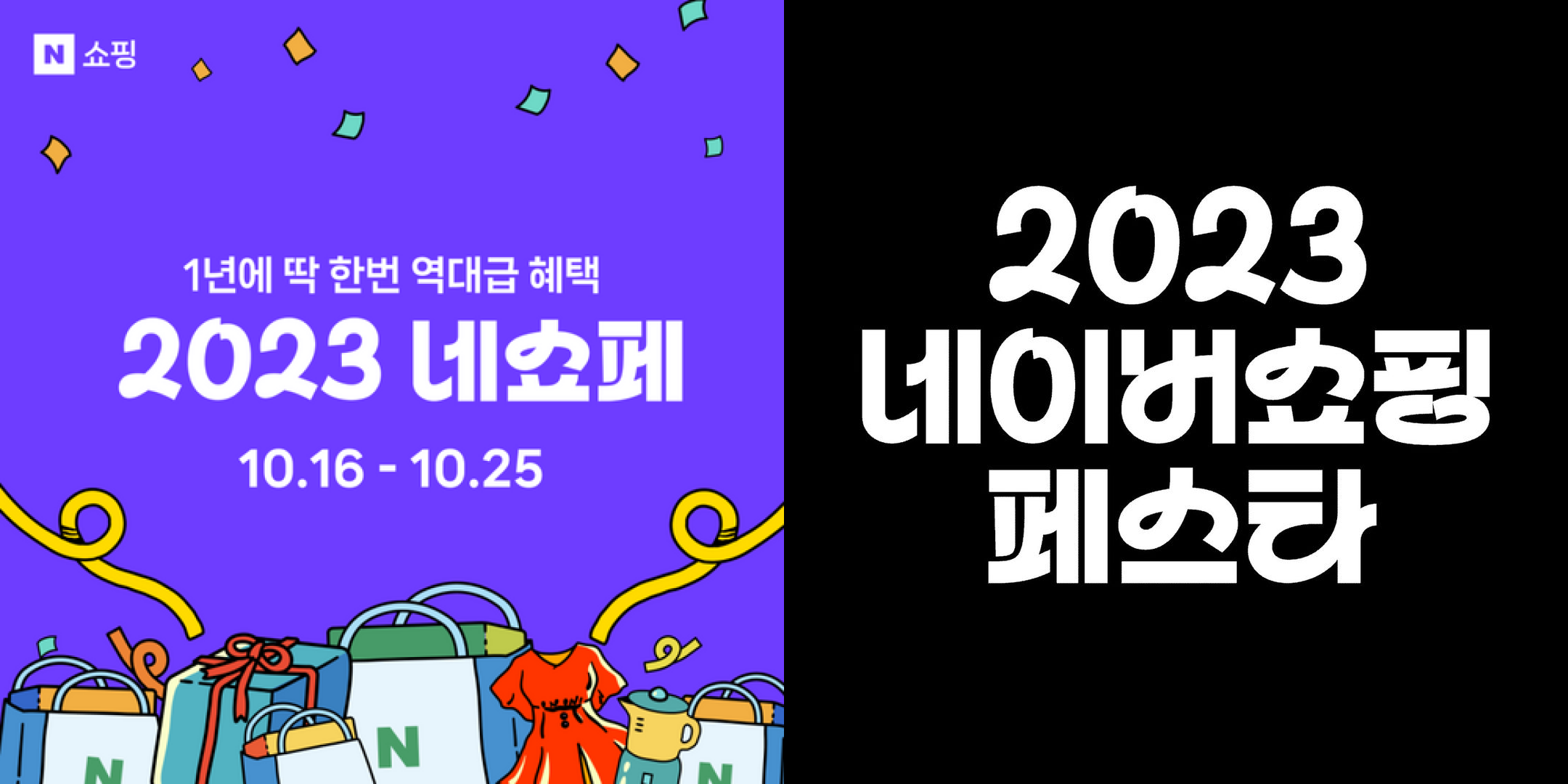 이러한 두 프로모션의 톤앤매너 차이는 타이포그래피에서도 명확히 드러납니다. '네이버쇼핑페스타'는 가볍고 활기찬 느낌의 폰트를 사용해 생동감 있는 축제 분위기를 잘 표현했습니다.