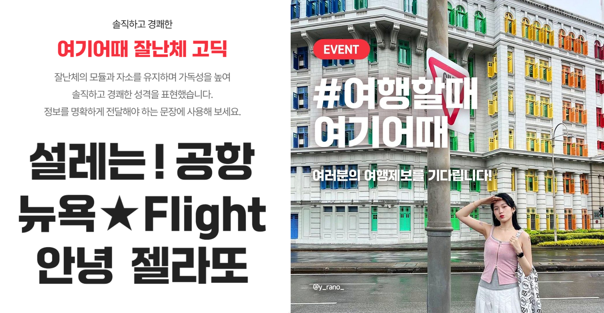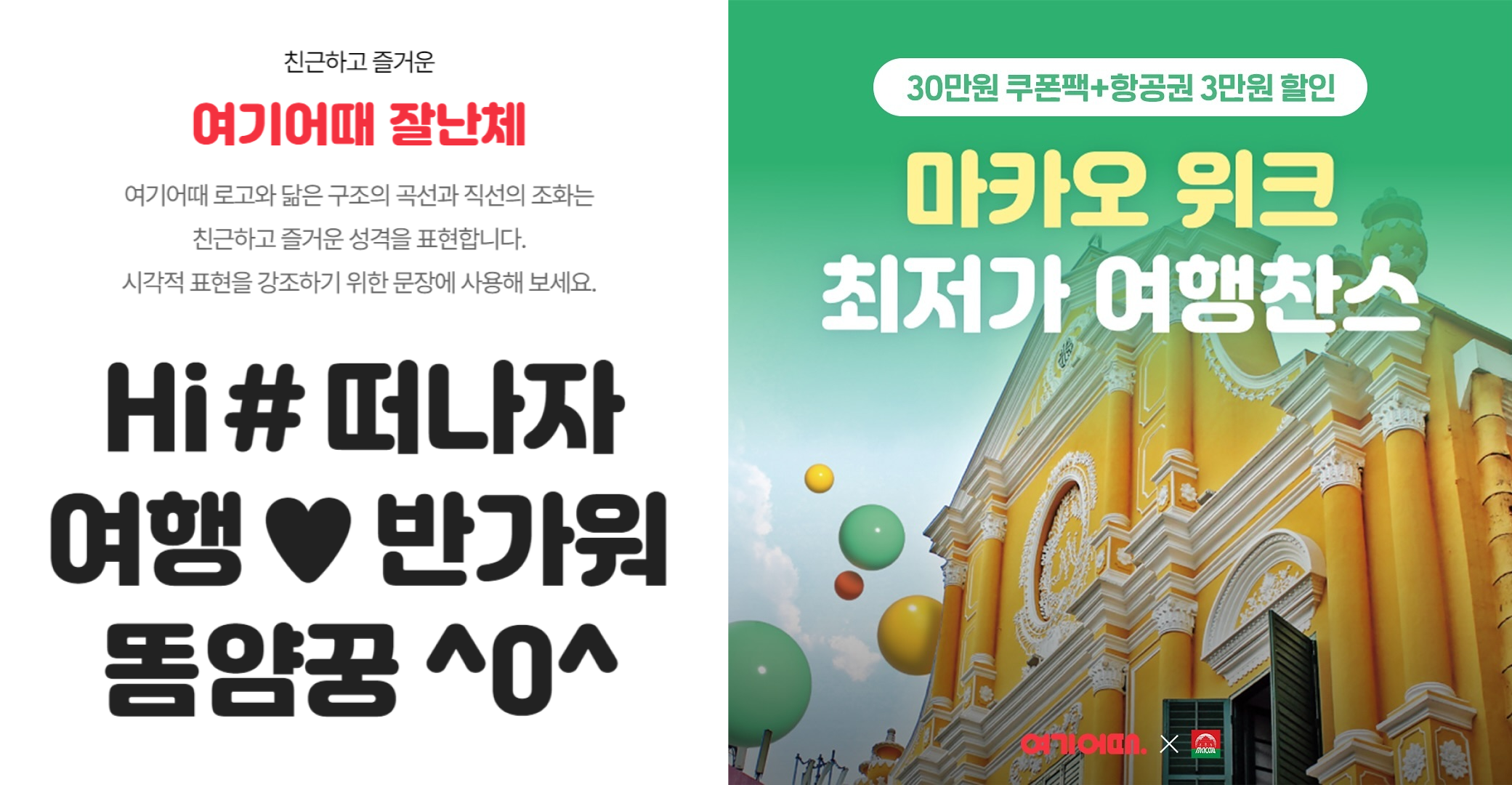 그리고 기존 잘난체가 다양한 곳에 활용됨으로써 브랜딩 효과를 인정받자 가독성을 더 높인 고딕 버전까지 출시되었어요. 여기어때의 자체 폰트는 활동적이고 경쾌한 느낌이 특징이라 여행의 즐거움이라는 브랜드 메시지를 잘 드러내주고 있습니다.