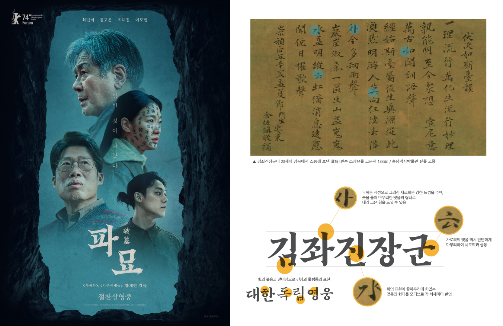 김좌진 장군체는 독립운동가 김좌진 장군의 이름을 딴 폰트로, 굳건한 의지와 애국심을 상징합니다. '파묘' 포스터에 이 폰트를 사용함으로써, 영화가 전달하고자 하는 강력한 메시지와 역사적 감정을 더욱 강조하고 있습니다. 타이포그래피는 단순히 눈에 띄는 디자인을 넘어서, 영화의 아이덴티티와 메시지를 효과적으로 홍보하는 데 큰 기여를 합니다.