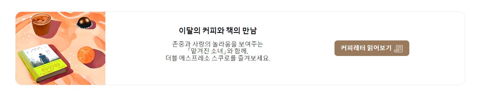 네스프레소 홈페이지에서는 매월 '이달의 책과 커피 소개'라는 특별한 콘텐츠를 선보이고 있어요. 이는 네스프레소와 최인아 책방이 공동 기획한 코너로, 커피와 함께 즐길 수 있는 책을 소개해요.