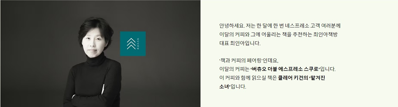 위의 내용은 최인아 대표가 네스프레소의 '버츄오 더블 에스프레소 스쿠로'의 특징을 설명하며 그와 어울리는 책인 클레어 키건의 『맡겨진 소녀』란 책을 자연스럽게 큐레이션 하고 있는 콘텐츠 인트로예요. 커피도, 책도 더 궁금해지게 만들지 않나요?