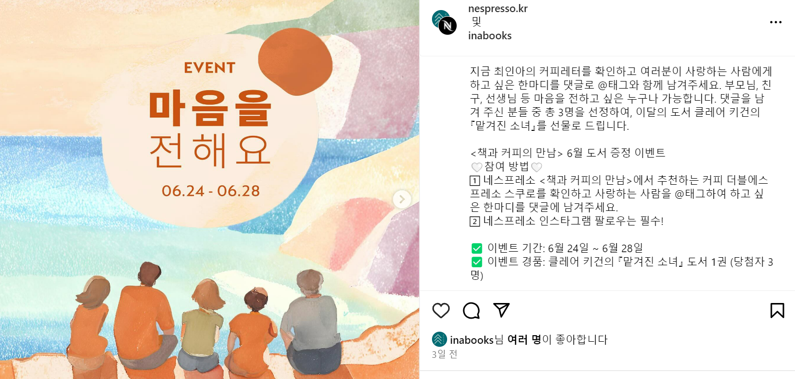정호승 작가의 『고통 없는 사랑은 없다』를 선정한 달에는 커피를 통해 자신만의 고통에서 벗어난 순간을 댓글로 공유하고, 클레어 키건 작가의 『맡겨진 소녀』 콘텐츠에선 사랑하는 사람에게 하고 싶은 한마디를 함께 남기는 이벤트를 진행하는 등 매월 발행되는 '이달의 책과 커피 소개'와 함께 '인스타그램 소환 이벤트'도 진행하며 콘텐츠를 확산시키고 있죠.