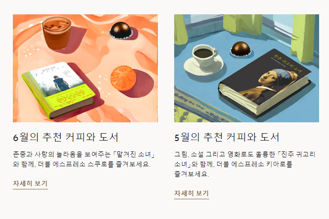 네스프레소 홈페이지를 통해 매월 발행되는 이 콘텐츠는 네스프레소의 커피와 어울리는 독서를 페어링 하는 차별화된 콘텐츠로 고객들에게 새로운 경험을 선사하죠.