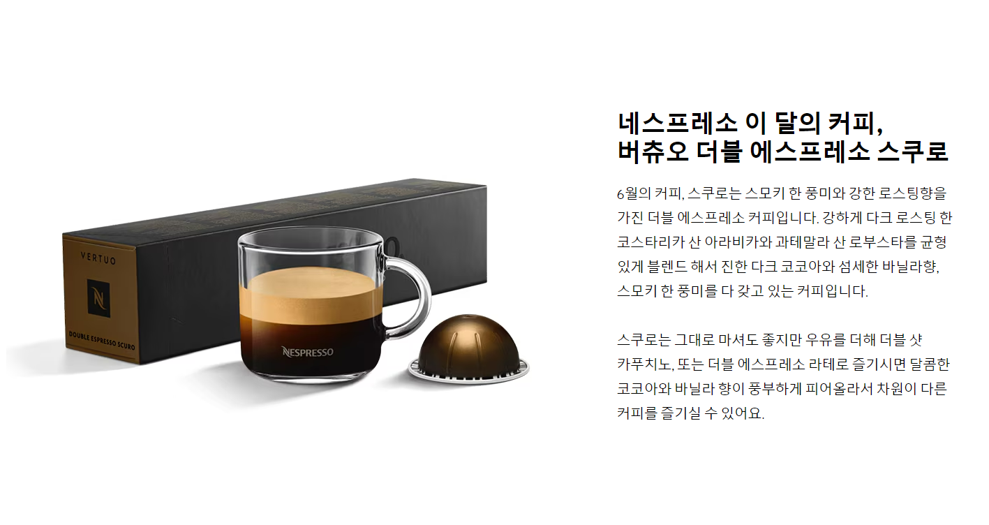 버츄오 더블 에스프레소 스쿠로는 아주 강도가 센 커피인데 얼음이나 물, 우유를 더하면 또 다른 맛으로 다양하게 즐기기 좋은 커피입니다. 부드러운 변화가 일어나는 거죠.