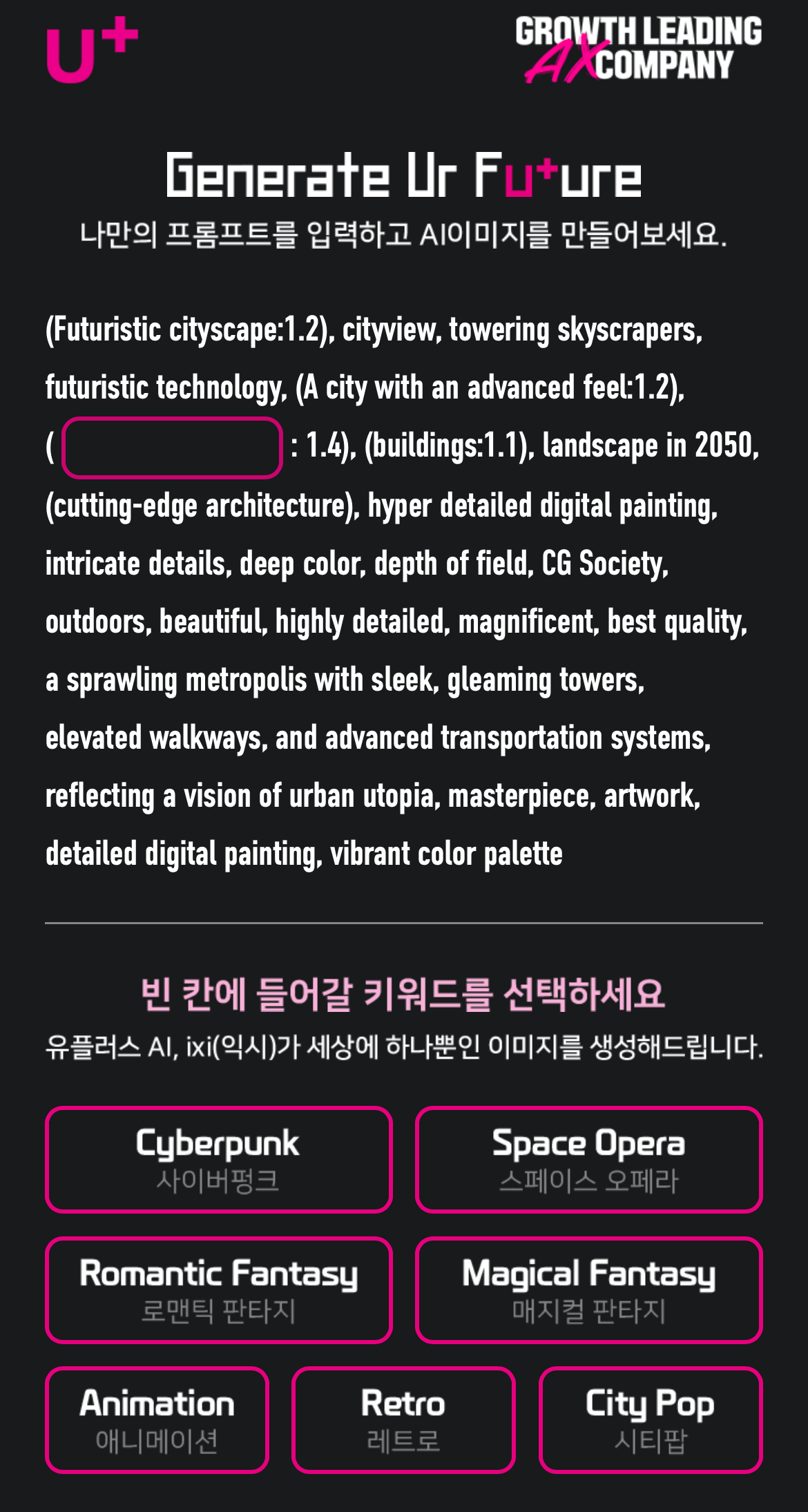사이버펑크, 스페이스 오페라, 로맨틱 판타지, 매지컬 판타지, 애니메이션, 레트로, 시티팝 등 7가지의 종류 중 선택한 프롬프트에 따라 다른 월페이퍼 이미지가 만들어진다고 해요.