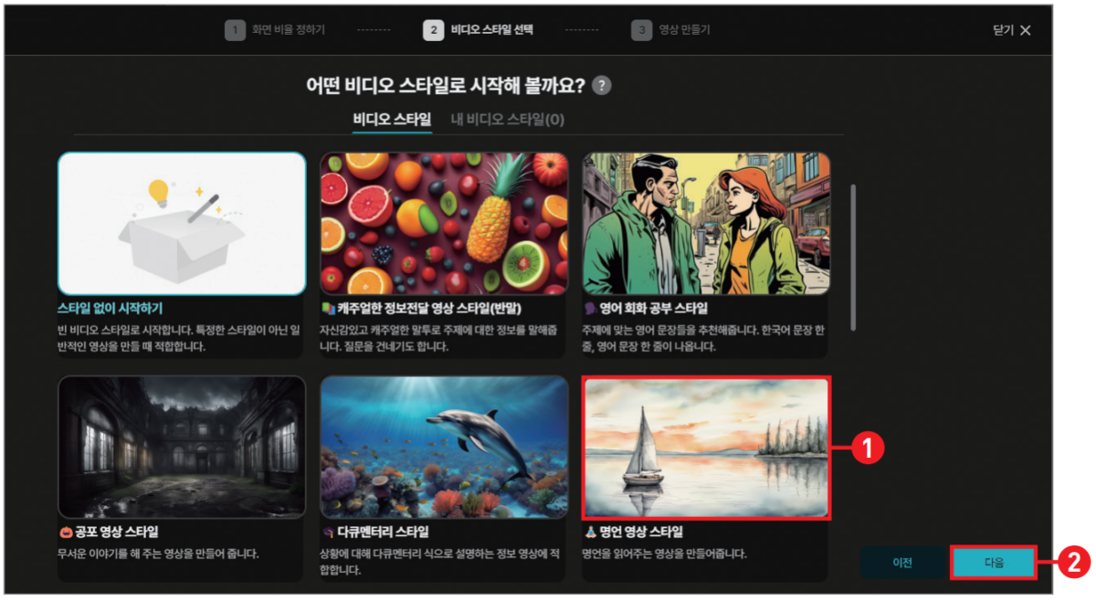 비디오 스타일을 선택하는 화면이 열리면 스포츠 브랜드 홍보 영상을 제작하고 있으므로 관련 영상을 선택한 후 [다음] 버튼을 클릭합니다. 스포츠 브랜드 홍보 영상은 ‘제품 홍보 영상 스타일’과 연관이 있지만, 브랜딩 영상으로 키워드가 ‘도전’인 동기 부여 영상을 제작할 것이므로 ‘명언 영상 스타일’이 더 연관 있어서 이 스타일을 선택했어요.