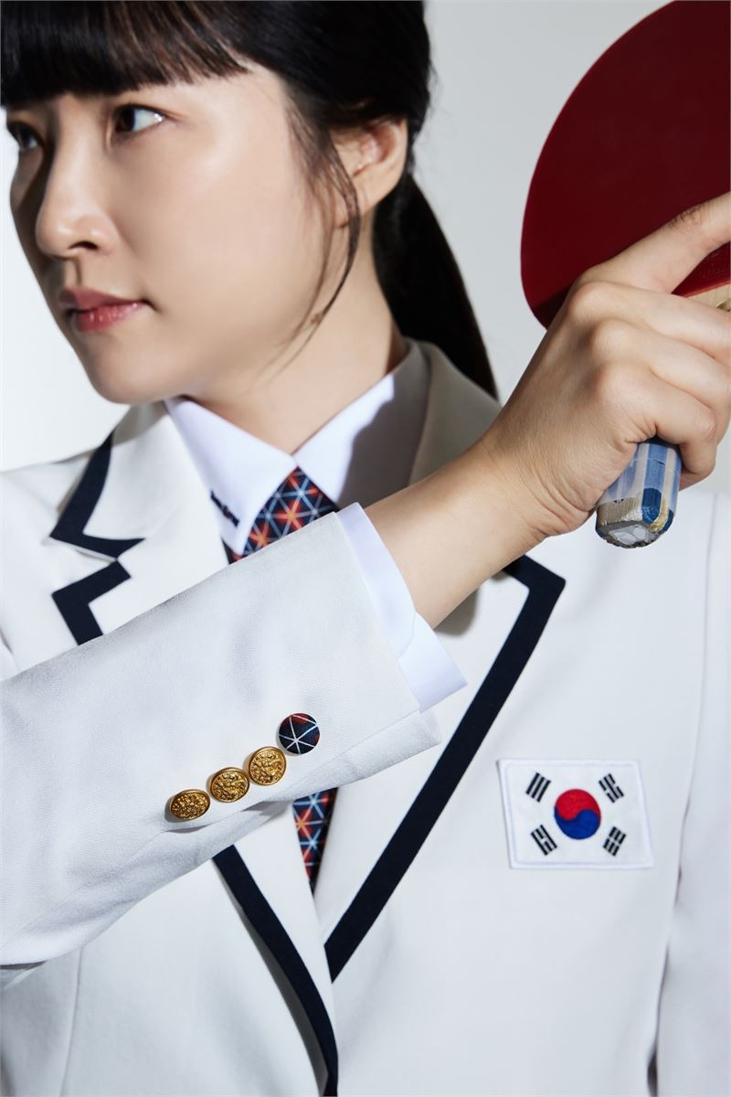 올림픽 국가대표팀의 단복은 벨티드 슈트 셋업으로, 벽청색을 사용해 젊음의 기상과 진취적인 정신을 나타냈어요. 재킷 안쪽에는 청화 백자의 도안을 새겨 넣어 한국의 전통미를 디테일로 넣었고, 재킷 위에 걸친 벨트는 전통 관복에서 허리에 두르던 ‘각대’를 재해석한 것이라고 합니다.