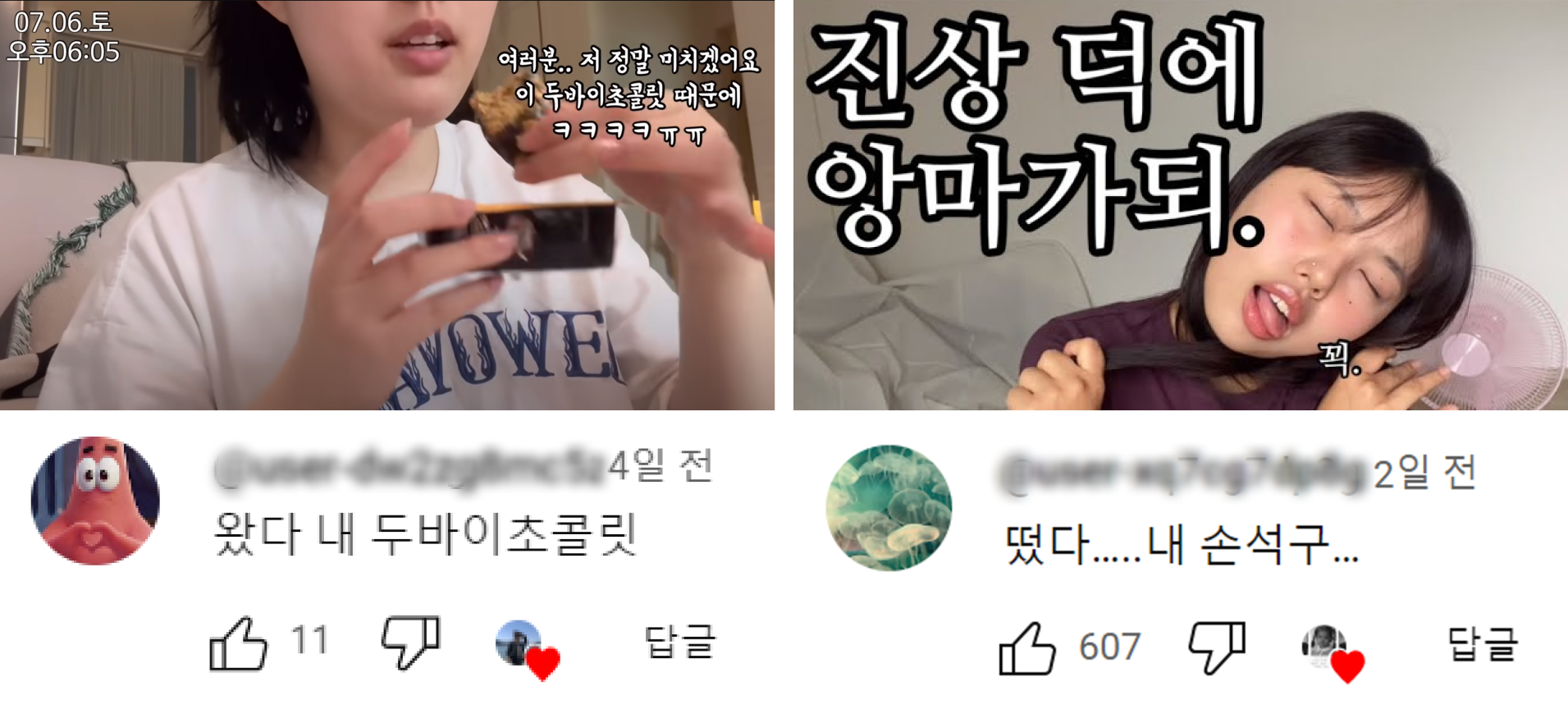 예를 들어 김풍이 등장하는 영상에는 댓글로 그가 창업했던 옾카페를 언급하며 '옾카페 문 닫는 속도로 달려왔습니다'라는 댓글이 달리기도 하고, 북한의 오물풍선이 언론에서 많이 언급되면서 '오물풍선처럼 날아왔습니다'라는 풍자적 밈이 생기기도 했어요. 그 외에도 다양하게 베리에이션 되는 댓글을 보며 사람들의 센스를 엿볼 수 있답니다.