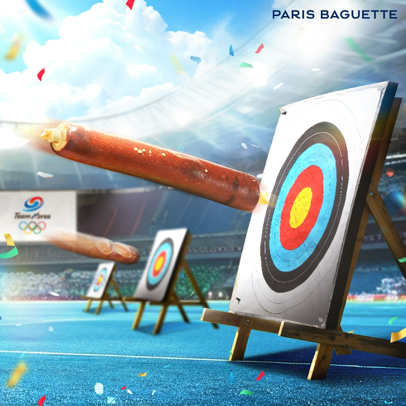 베스킨라빈스, 던킨도너츠, 파리바게트 등 달달한 디저트 브랜드를 보유한 SPC에서도 제품을 부각한 페이크 광고에 집중하고 있어요. 베스킨라빈스의 ‘팥 있는 녹차당’ 메뉴를 홍보하기 위해 하동 녹차밭에서 직접 아이스크림 스쿱으로 퍼올린 것처럼 이미지를 제작해 마치 갓 따온 녹차처럼 표현했죠. 뿐만 아니라 최근에 있었던 파리 올림픽 시즌에는 과녁을 향해 날아가는 화살처럼 빵 모양을 형상화하기도 했어요.