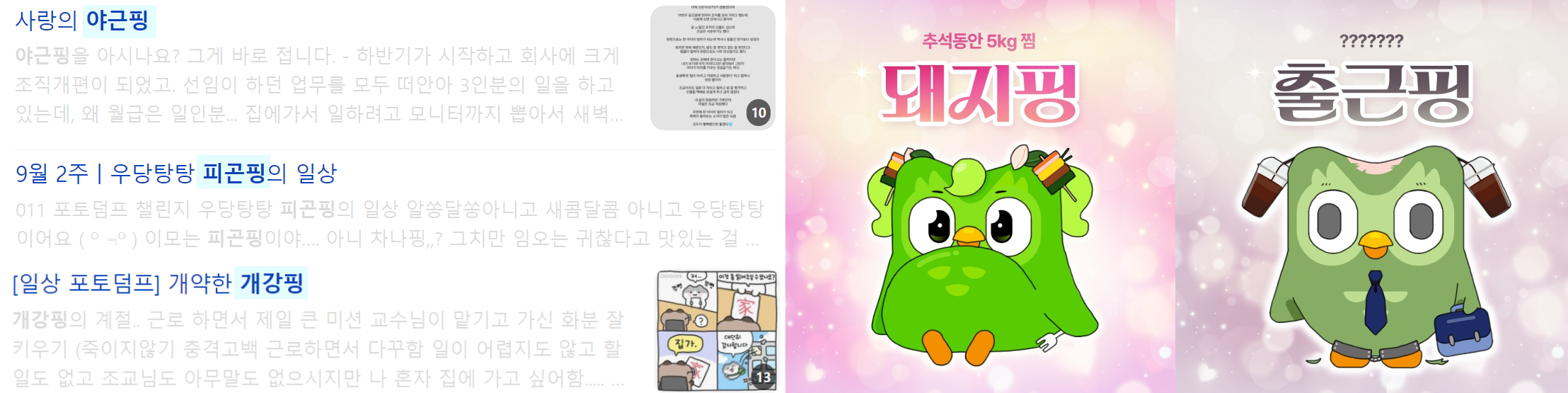 어린이의 콘텐츠를 어른들의 시각으로 재해석할 뿐만 아니라, 티니핑에 나오지도 않는 새로운 핑을 만들어내는 것이 밈으로 자리 잡았어요. 특히 이 밈은 주로 어른들의 현실이 반영되는 경우가 많아요. '야근핑, 개강핑' 등 현실에서 하기 싫은 것들을 OO핑에 담아내거나 '피곤핑'처럼 현재 내가 느끼는 감정들을 직관적으로 표현하기도 해요.