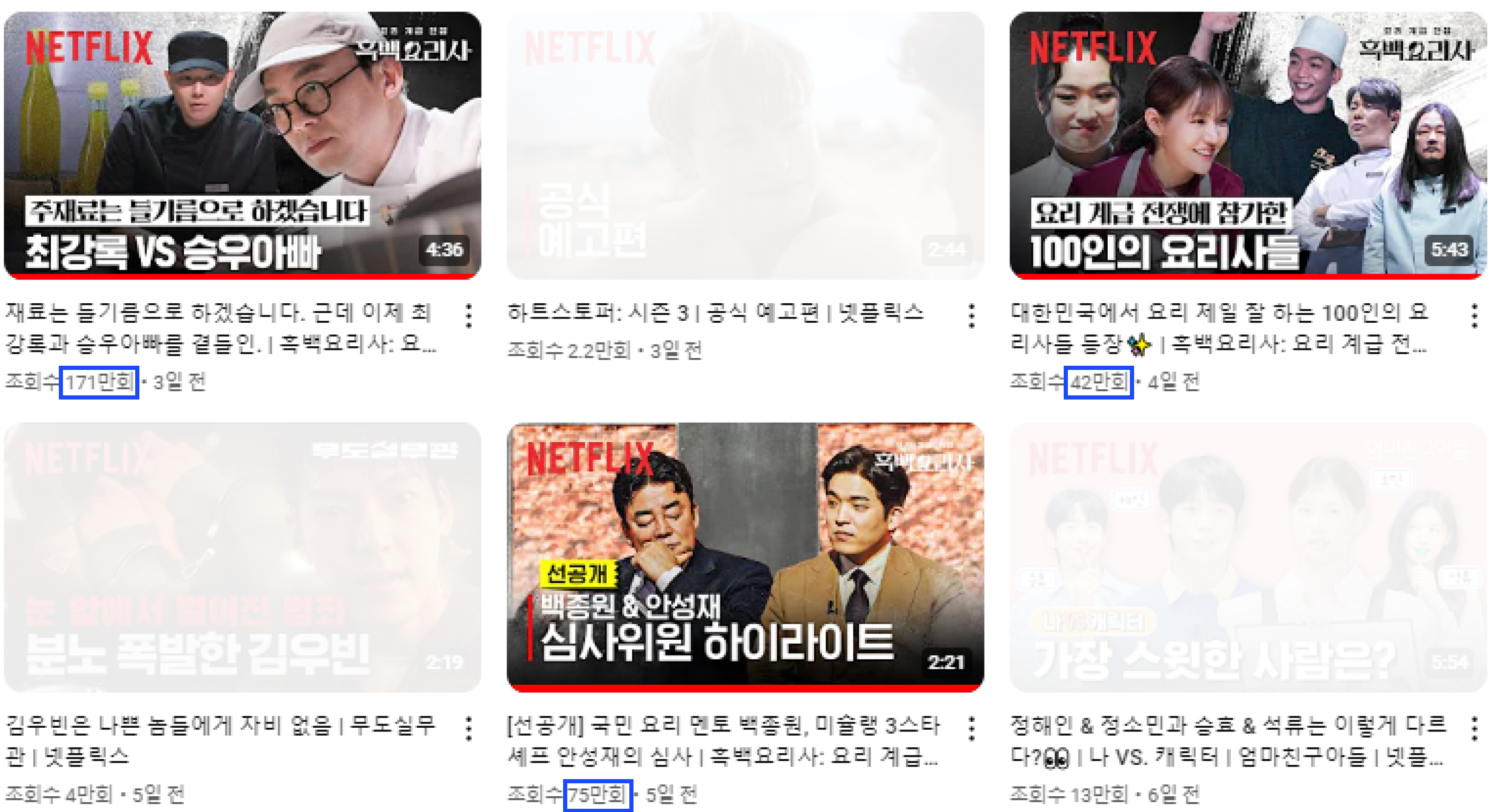 요즘 가장 핫한 프로그램은 넷플릭스 오리지널 서바이벌 예능 <흑백요리사:요리 계급 전쟁>이라고 자신 있게 말할 수 있는데요. 한국 넷플릭스 순위 1위를 달리고 있는 데다가, 유튜브에 관련 콘텐츠를 올리기만 하면 엄청난 조회수를 기록하고 있답니다. 넷플릭스 코리아 유튜브의 다른 영상의 몇 배가 되는 수준이죠.