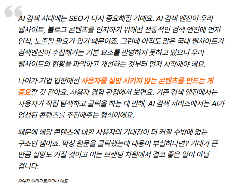 AI의 레이더망은 구글과 달리 SEO를 충족했다는 이유로 단순 홍보성, 광고성 글을 허락할 만큼 만만하지 않을 테니 말입니다. 관련해 콘텐츠 그로스 그룹 엘리펀트컴퍼니의 김예지 대표는 이렇게 말합니다.