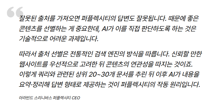 아라빈드 스리니바스 퍼플렉시티 CEO도 국내외 인터뷰를 통해 비슷한 말을 해왔습니다. 퍼플렉시티에 따르면, 답변에 활용되는 출처는 다음과 같은 기준에 따라 선택됩니다. 첫째, 트래픽이 높고 이탈률이 적은 웹 페이지의 콘텐츠일 것. 둘째, 콘텐츠 내용이 사용자의 질문과 관련이 있을 것.