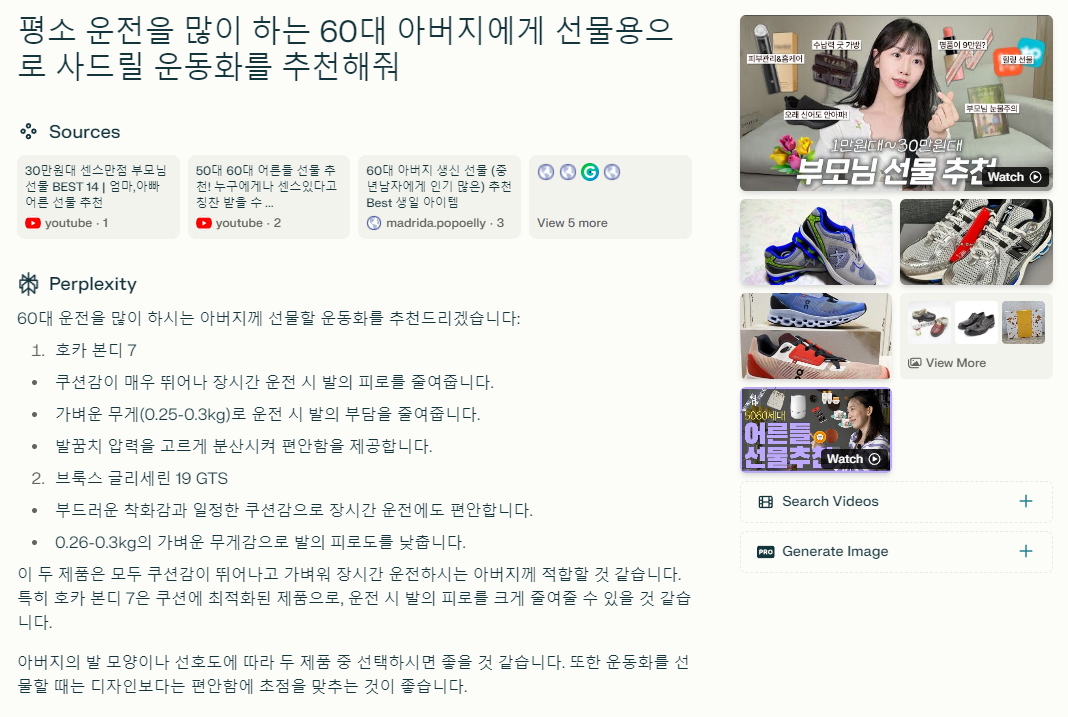 예컨대 평소 운전을 많이 하는 60대 아버지에게 선물용으로 사드릴 운동화를 찾는다면 어떻게 해야 할까요? AI 검색 서비스에는 이 문장 그대로 입력한 뒤 “추천해줘” 한 마디만 덧붙이면 됩니다. 반면 구글이라면 ‘중년 남자 운동화 추천’ ‘운전자 운동화 추천’ ‘선물용 운동화 추천’ 등으로 쪼개 검색해야 할 테고요. 당연히 마케터 입장에선 문장 형태의 검색어가 소비자 의도를 파악하기에 더 적합할 겁니다.