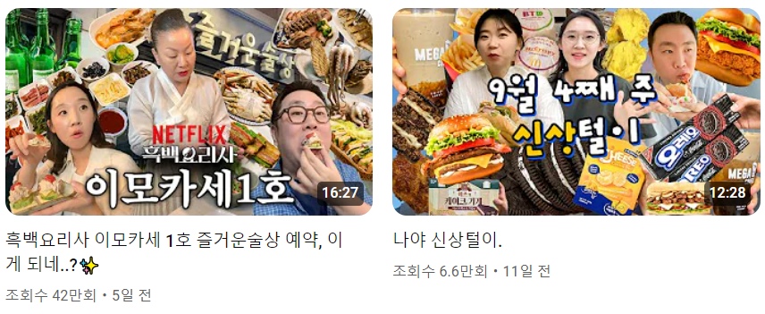 이모카세 식당과 같이 요즘 핫한 식당의 실제 방문기를 올리기도 해서 인기 많은 맛집 알 수 있고, 트레이더스나 이마트 추천템 같은 영상도 많이 올리기 때문에 전반적인 푸드 트렌드를 떠먹여 주는 채널이라고 생각하시면 돼요. 음식 트렌드는 이 채널에서 찾아보시는 걸 추천드릴게요.