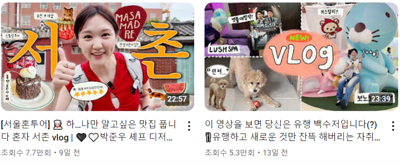 마지막으로 소개해드릴 유튜버는 강쥐님입니다. 위에 소개해드린 채널과 달리 강쥐G는 브이로그 채널이에요. 일상적인 부분들을 많이 담다 보니 음식, 패션, 뷰티 등 다양한 주제의 영상이 업로드되는데요. 특히 저는 핫플 찾고 싶을 때 많이 참고하는 편이랍니다. 일반적인 브이로거들처럼 자신의 일상을 흘러가듯이 기록하는 게 아니라 핫한 공간들을 열심히 찾아다니려고 노력하는 모습이 보여요.