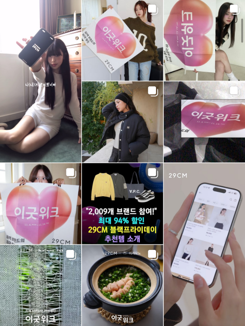 실제로 29CM 이굿위크 시즌이 되면 유튜브, 인스타그램 등 SNS에서 이굿위크 추천템, 꿀팁 등 다양한 아이템 추천 콘텐츠들이 올라옵니다. 대표적인 29CM 행사로 자리 잡자, 고객들이 자발적으로 행사에 참여하고 서로에게 알리는 바이럴 콘텐츠들이 생성된 것입니다.
