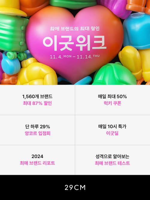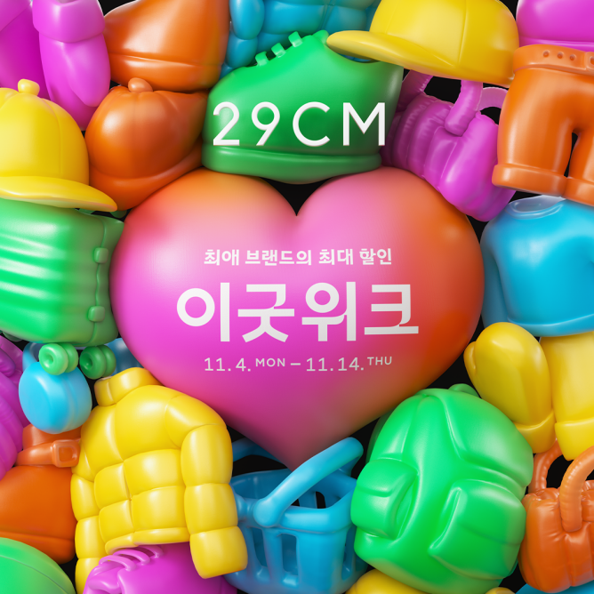 29CM에서 진행하는 최대 규모의 할인 행사, 이굿위크가 시작됐어요! 행사는 11월 4일부터 11월 14일까지 2주 간 진행되는데요. 이번 이굿위크는 1,560개 브랜드가 참여하고 최대 87% 할인이라는 그야말로 역대급 혜택이 준비되어 있다고 해요. 모두가 기다려 온 대대적 행사인 만큼 소비자들의 반응 또한 뜨거운 상황입니다!