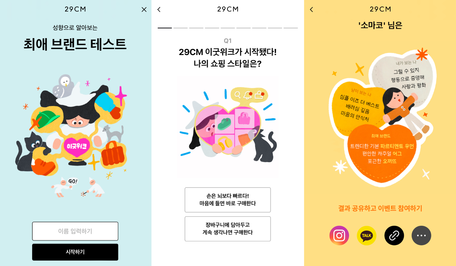 또한 고객들이 실제 본인의 최애 브랜드를 아직 찾지 못했을 경우를 위해, 고객의 최애 브랜드를 찾아주는 ‘최애 브랜드 테스트’를 이굿위크와 함께 진행했어요.
