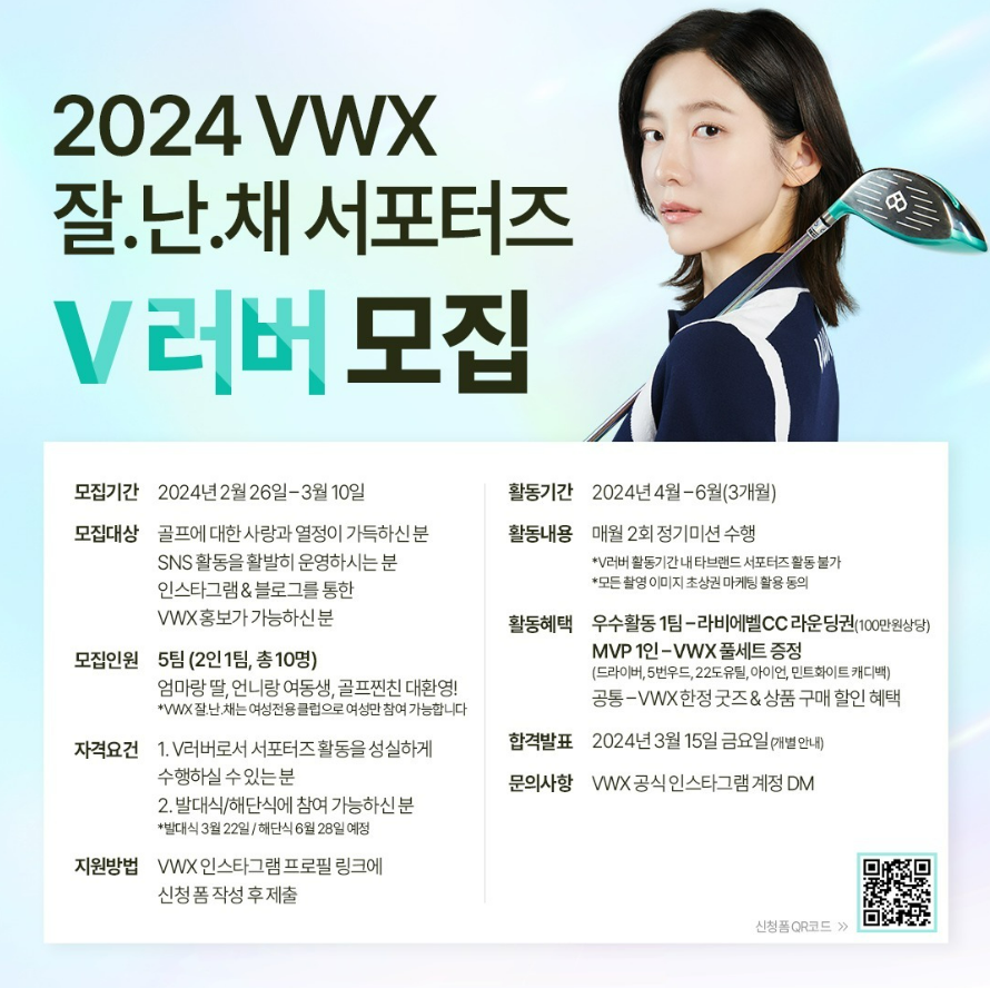 여성 전용 골프채 라는 컨셉에 맞춰 여성들만 활동이 가능한 VWX의 V-LOVER는 여성 소비자들의 입장에서 솔직,담백하게 이야기 할 수 있는 고객 참여형 서포터즈 활동으로, 앞으로도 꾸준히 서포터즈를 모집하며, 브랜드를 이야기 할 예정이라고 해요.